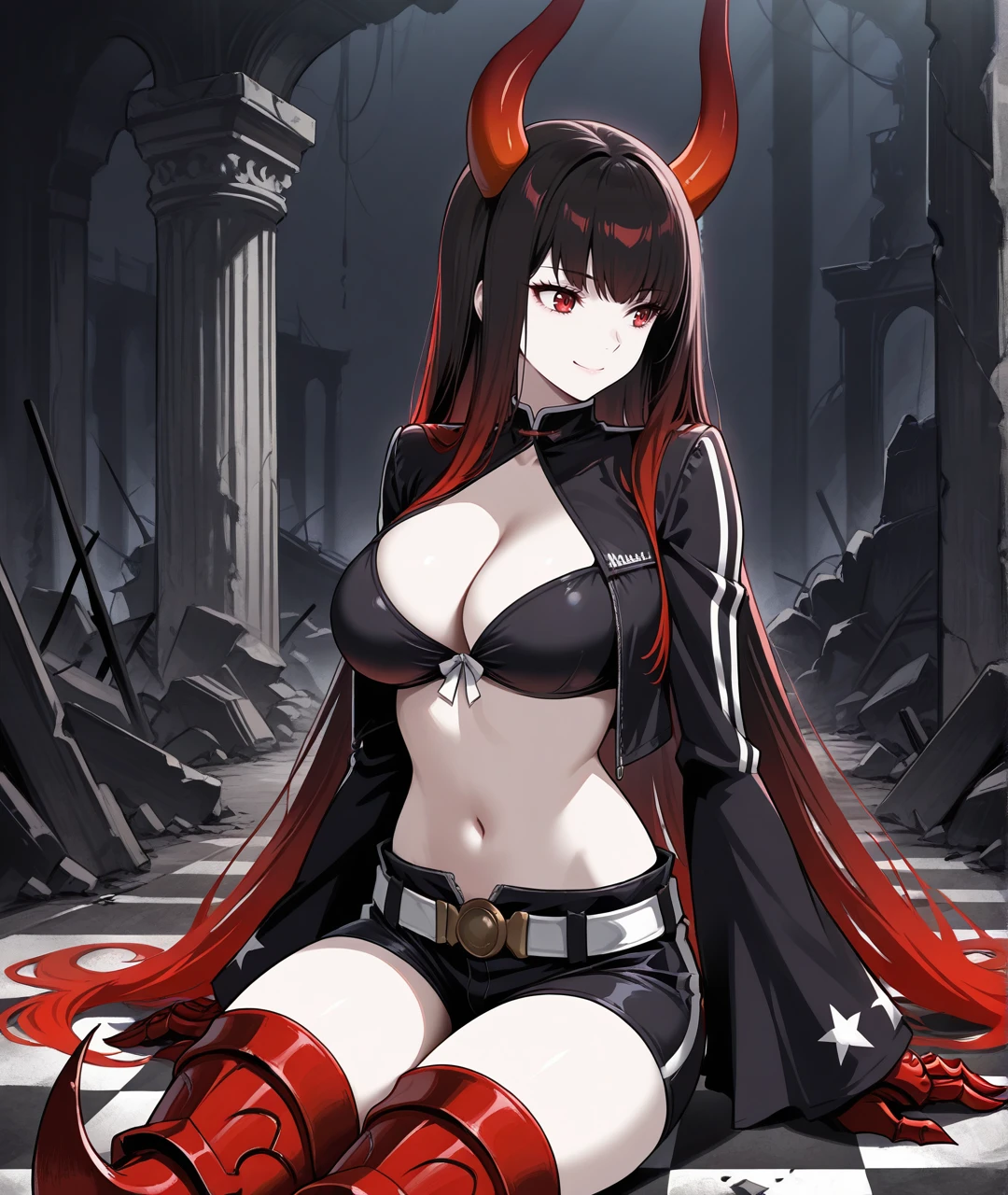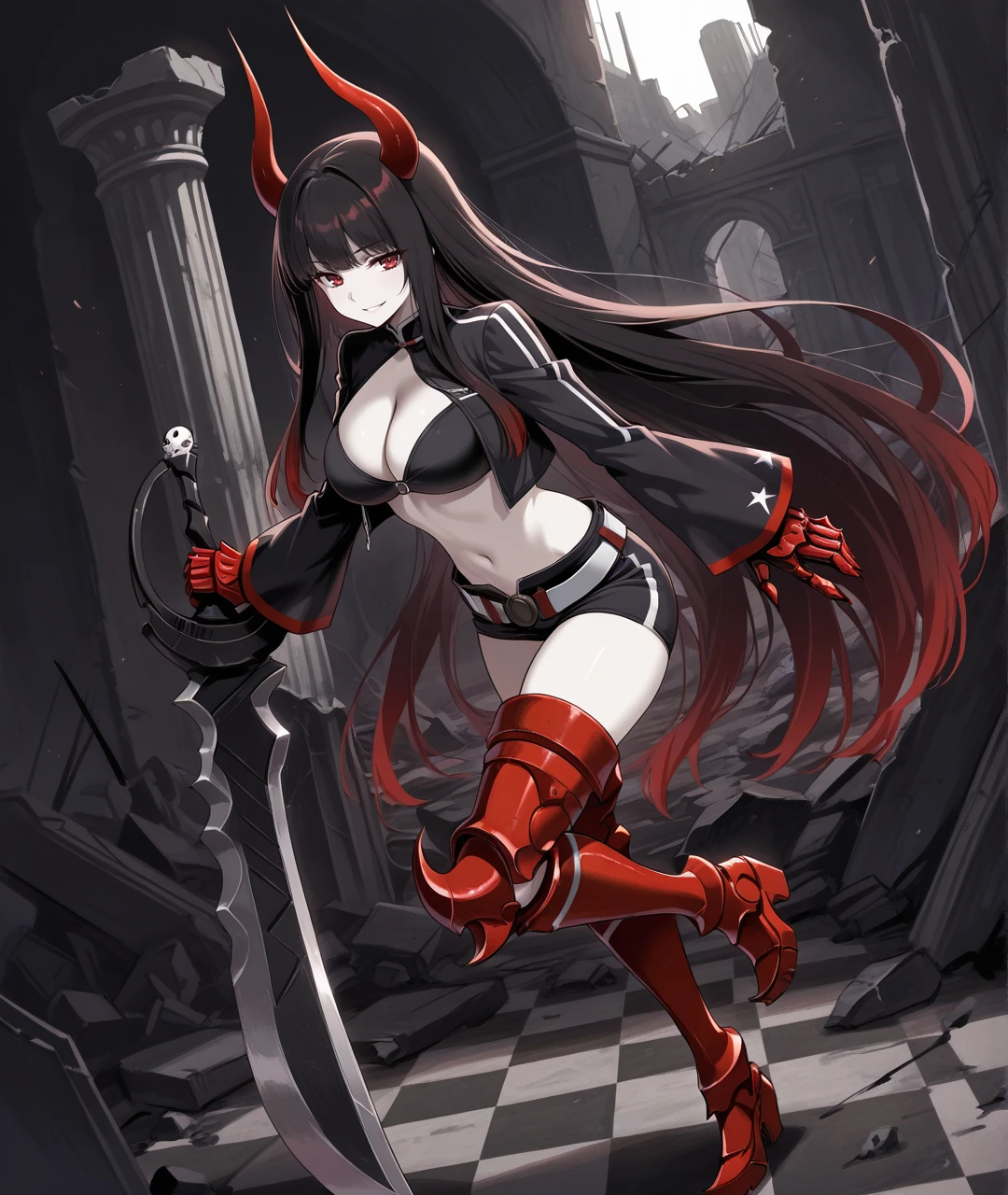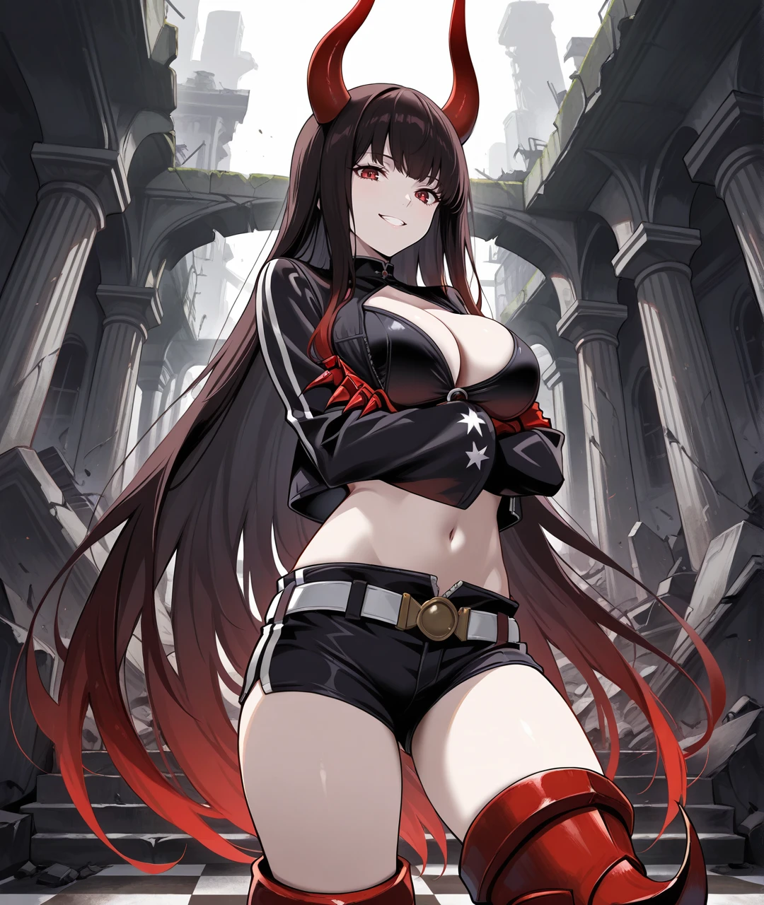 BGSBase, pale skin, red horns, red eyes, gradient hair, two-tone hair, multicolored hair, black hair, red hair, very long hair, black chocker, medium breasts, black jacket, cropped jacket, , long sleeves, black top, crop top, cleavage cutout, revealing clothes, midriff, navel, red gauntlets, armored gauntlets, red claws, black shorts, white belt, belt buckle, armor, armored legwear, thigh boots, armored boots, heeled boots,