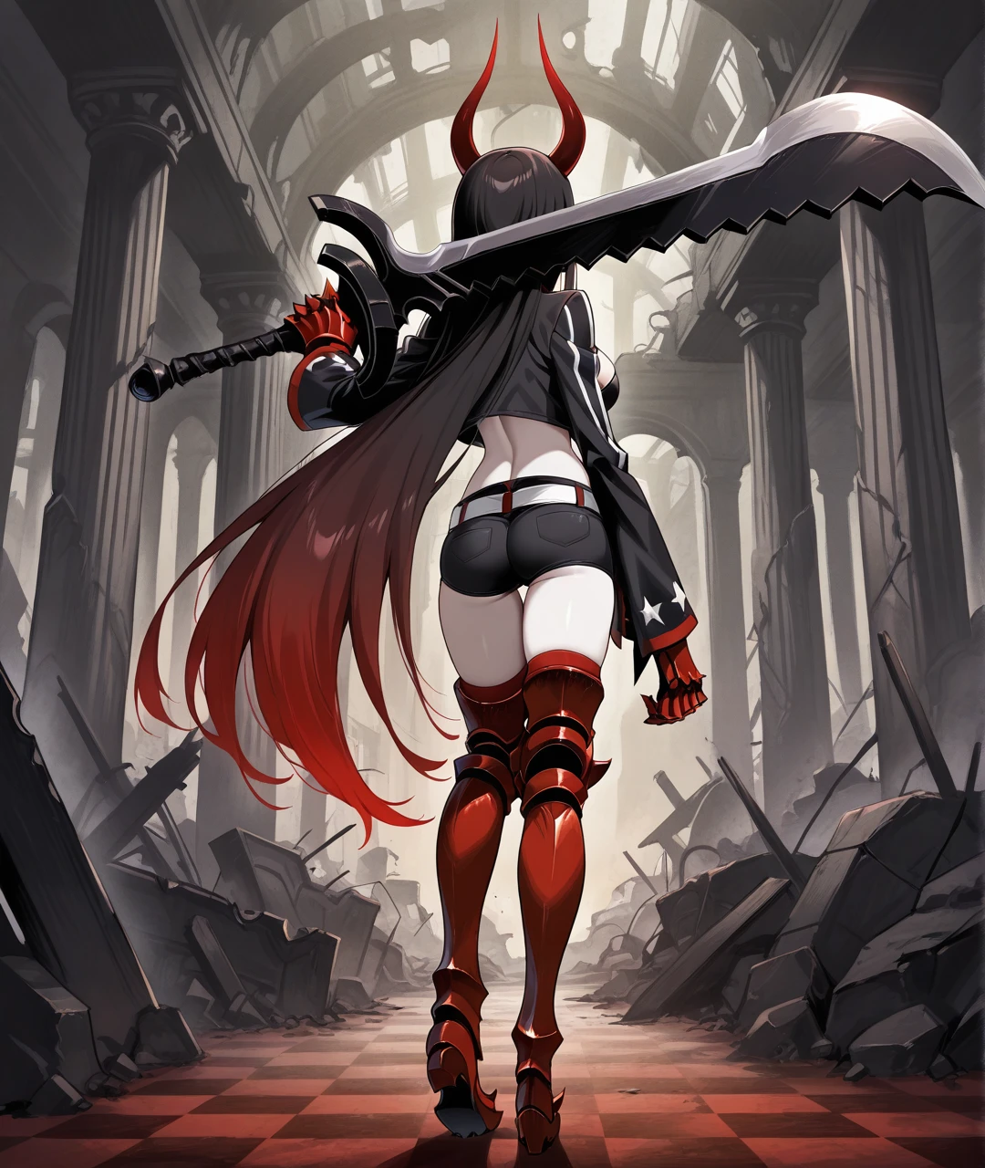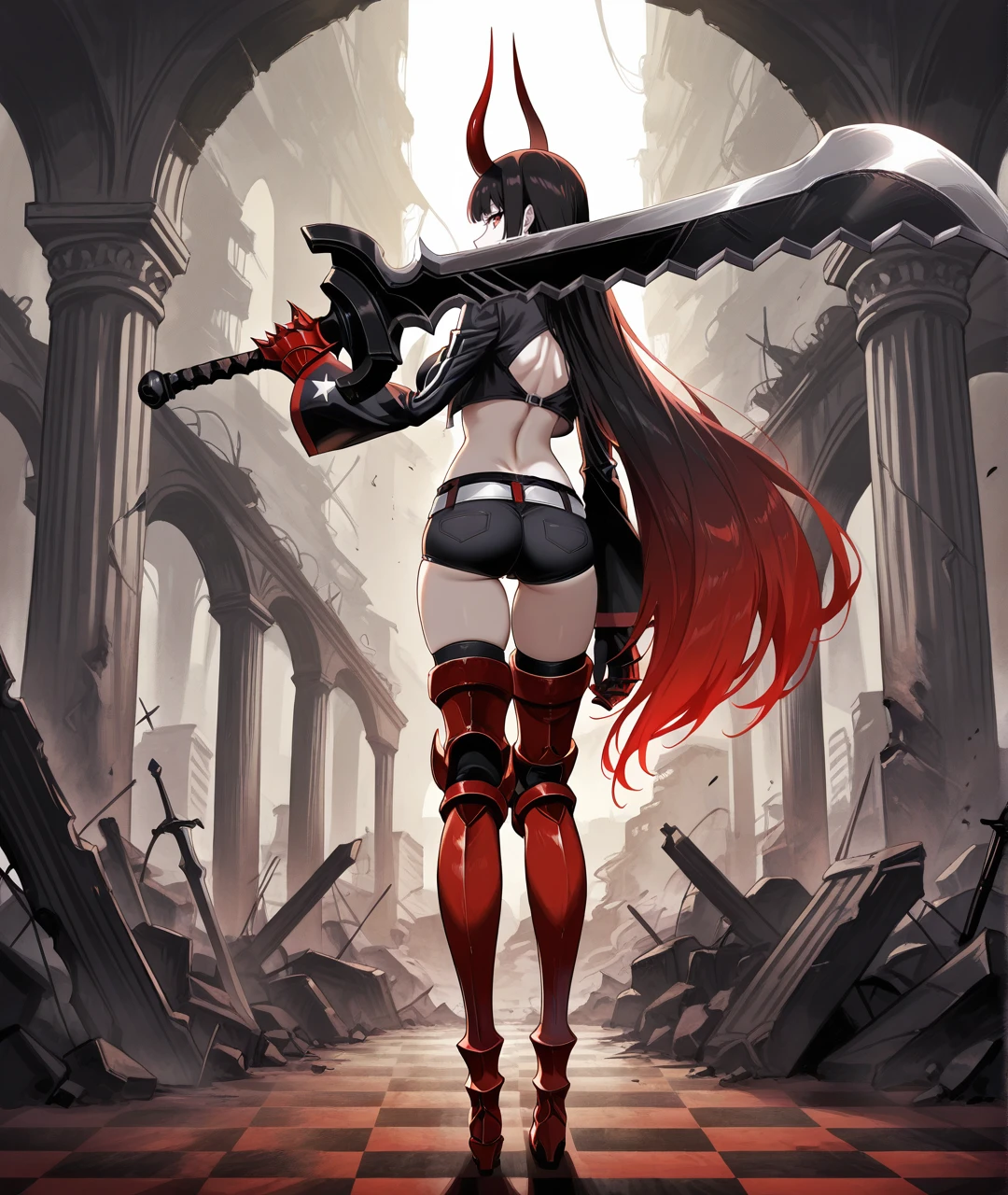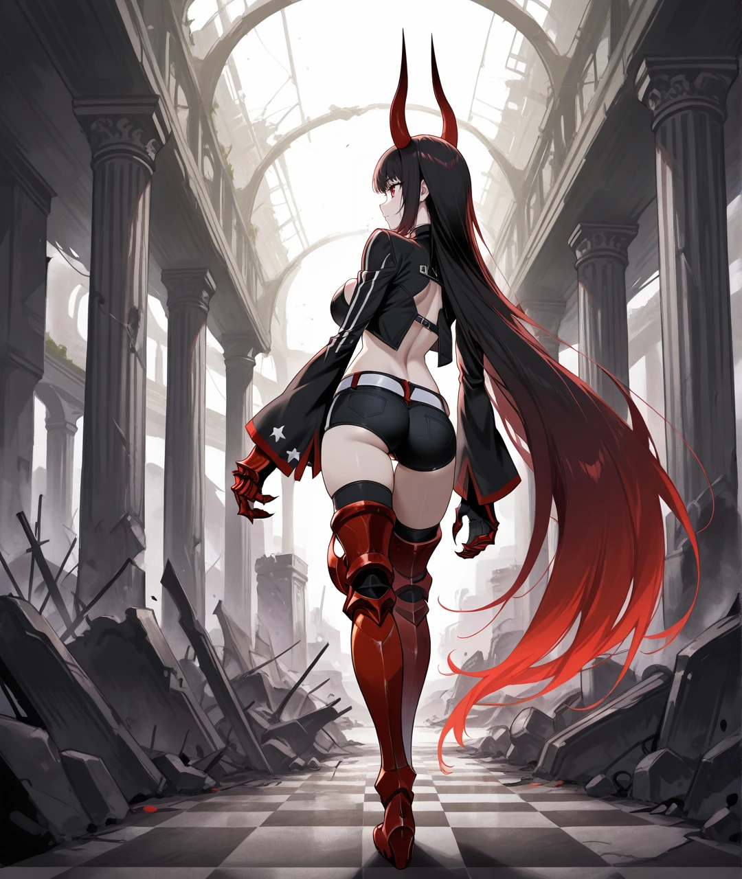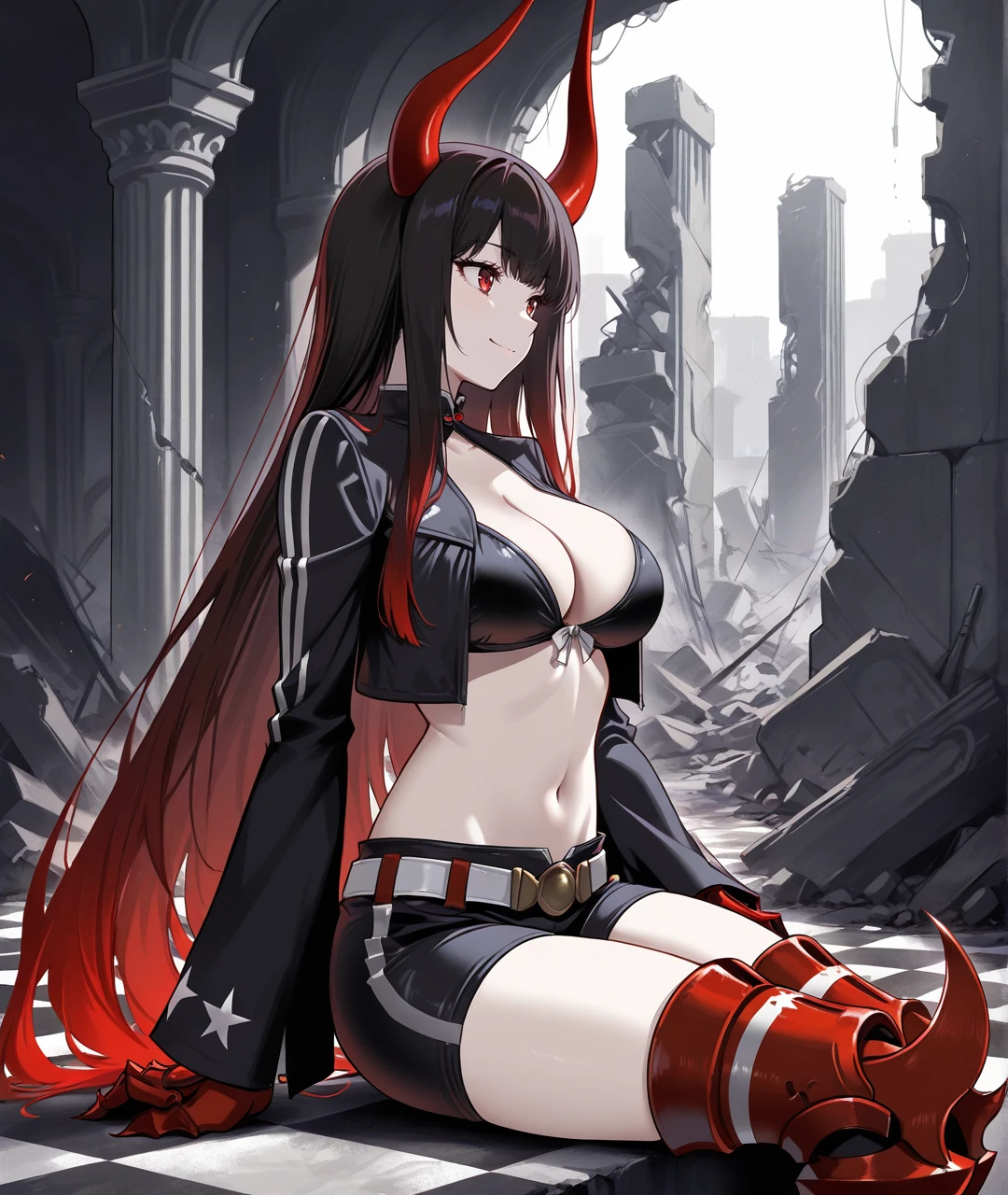 BGSBase, pale skin, red horns, red eyes, gradient hair, two-tone hair, multicolored hair, black hair, red hair, very long hair, black chocker, medium breasts, black jacket, cropped jacket, , long sleeves, black top, crop top, cleavage cutout, revealing clothes, midriff, navel, red gauntlets, armored gauntlets, red claws, black shorts, white belt, belt buckle, armor, armored legwear, thigh boots, armored boots, heeled boots,