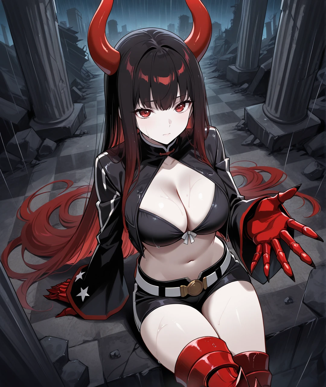 Character Tags: BGSBase, pale skin, red horns, red eyes, gradient hair, two-tone hair, multicolored hair, black hair, red hair, very long hair, black chocker, medium breasts, black jacket, cropped jacket, open jacket, long sleeves, black top, crop top, cleavage cutout, revealing clothes, midriff, navel, red gauntlets, armored gauntlets, red claws, black shorts, white belt, belt buckle, armor, armored legwear, thigh boots, armored boots, heeled boots,