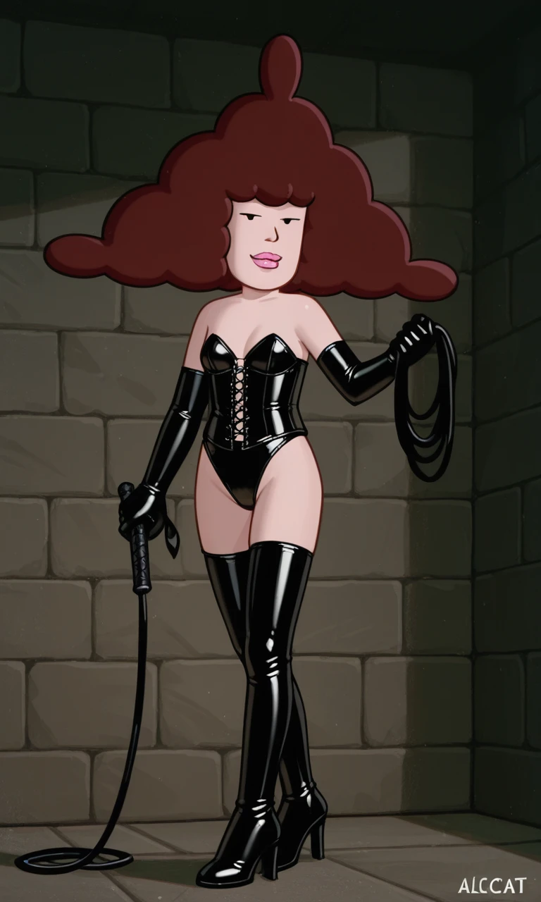 AlcDbt, 1girl, brown hair, black eyes, no sclera, triangle-shaped hair, curly hair, pink lips