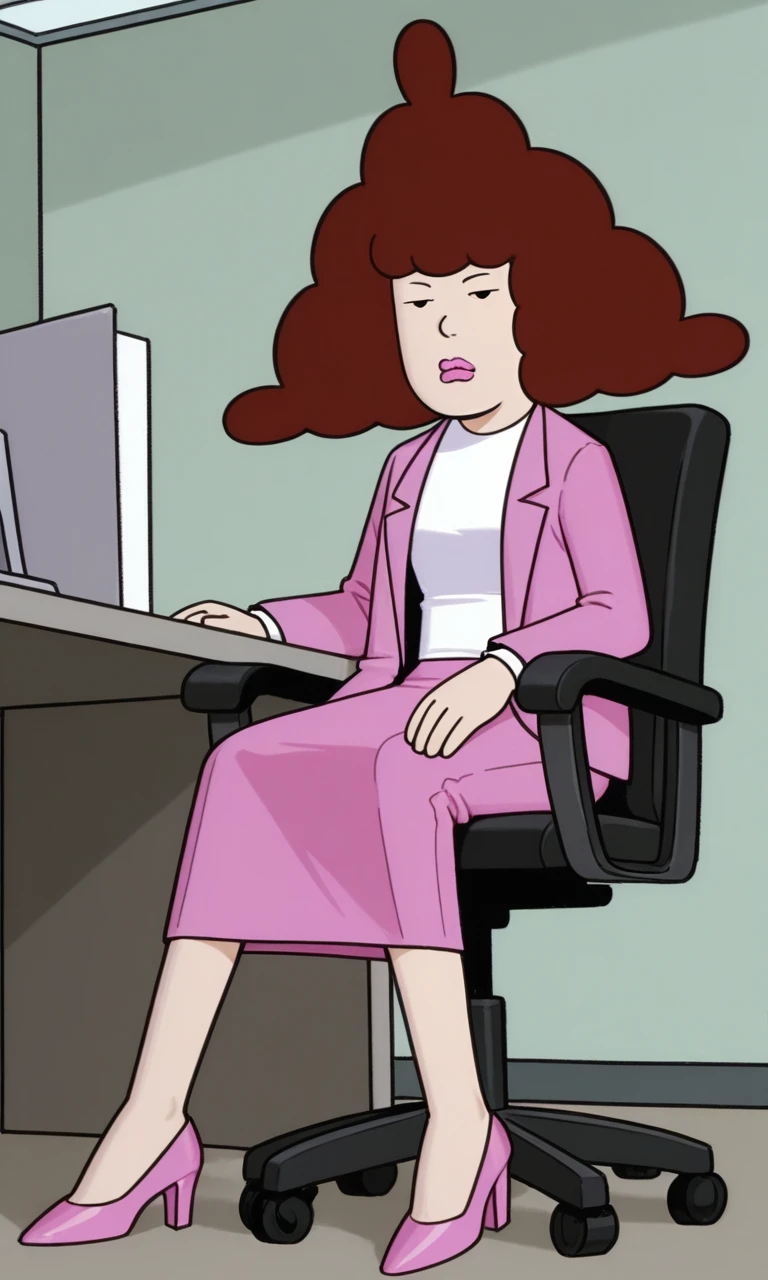 pink suit jacket, , white undershirt, pink skirt, pink high heels