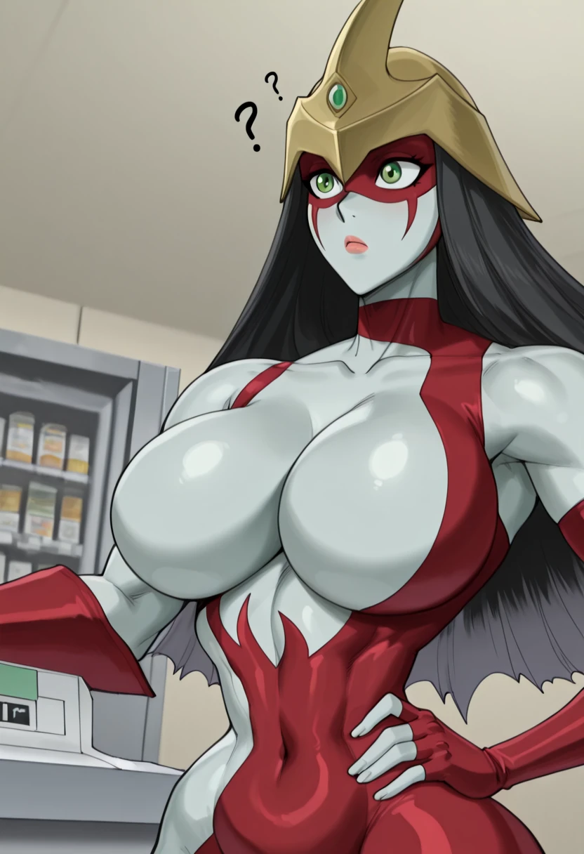 black hair, long hair, grey skin, grey skin color, green eyes, gold helmet, red domino mask,