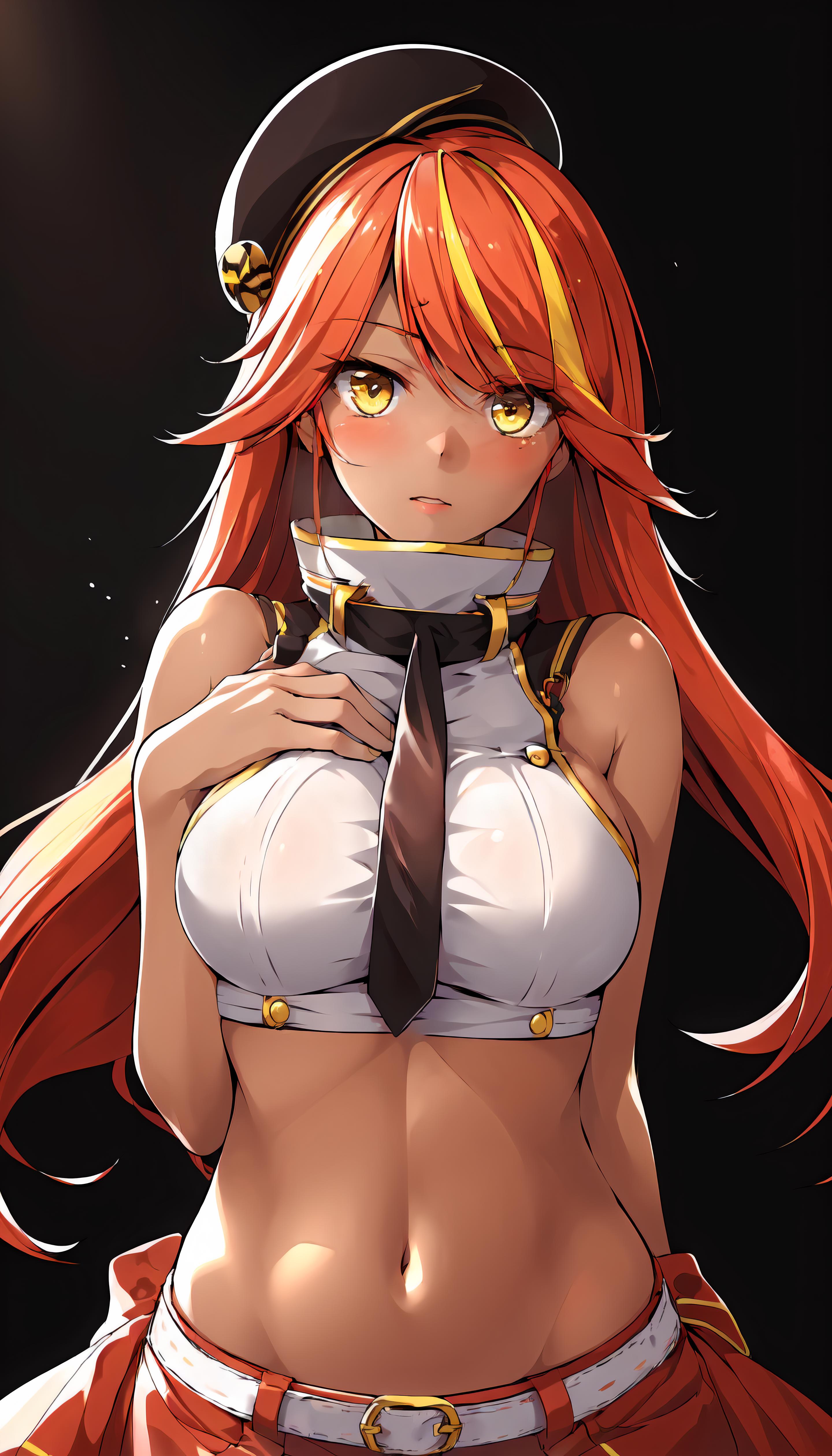 1girl, solo, navel, beret, collar, yellow eyes, multicolored hair, black skin, necktie;