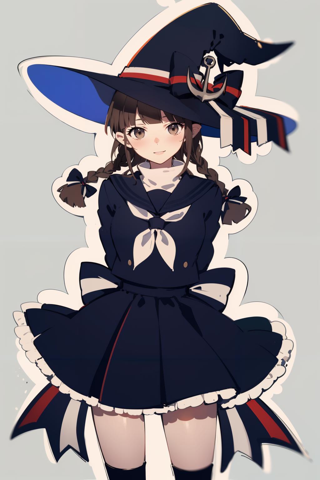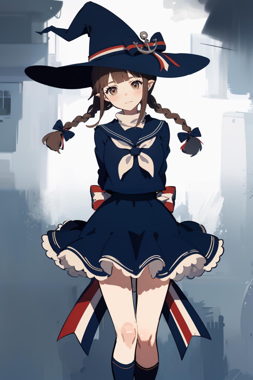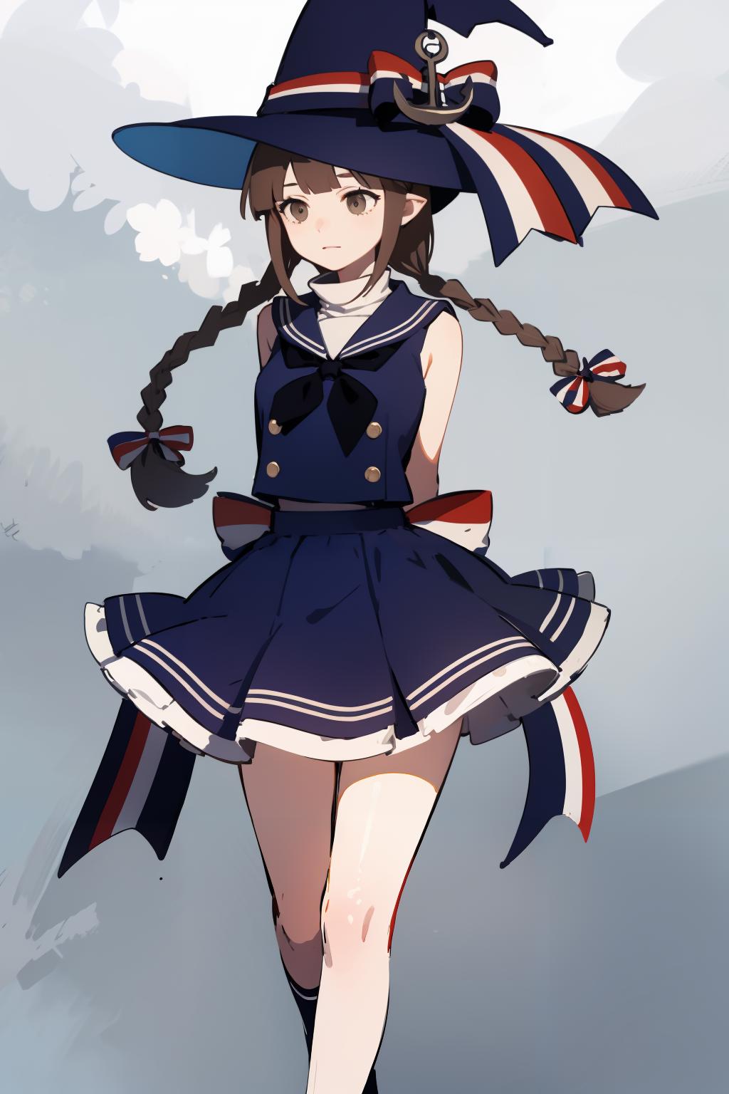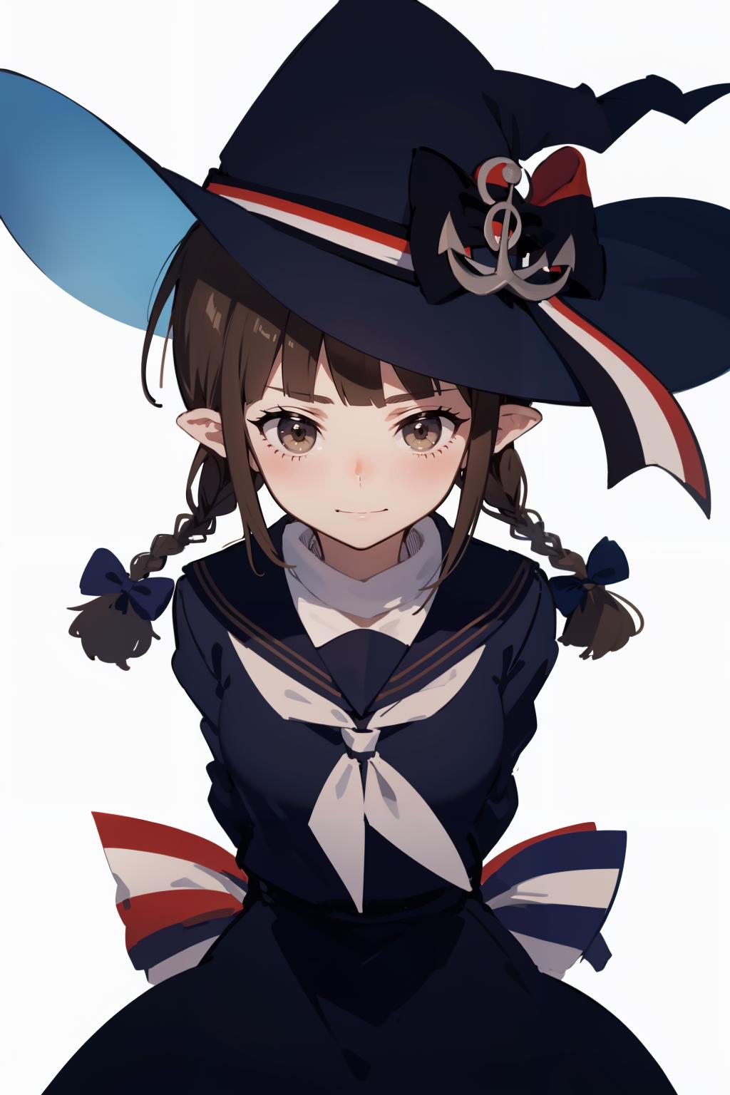wadanohara,witch hat,hat bow,multicolored bow,blue dress,blue hat,twin braid,long hair,handkerchief,anchor,hat ornament,school uniform,sailor collar,white bow,multicolored ribbon