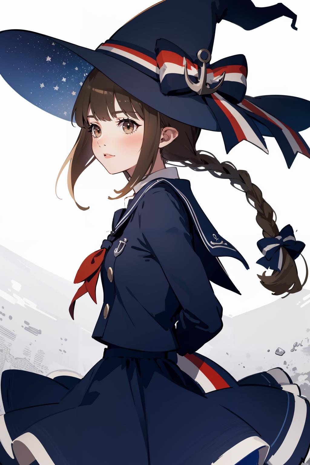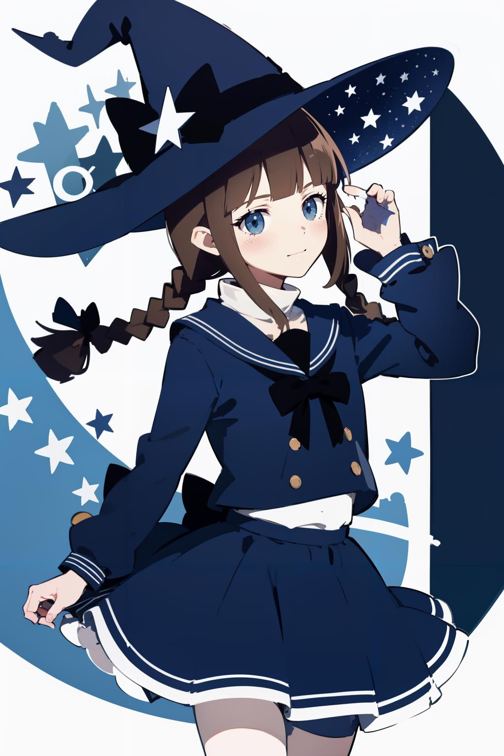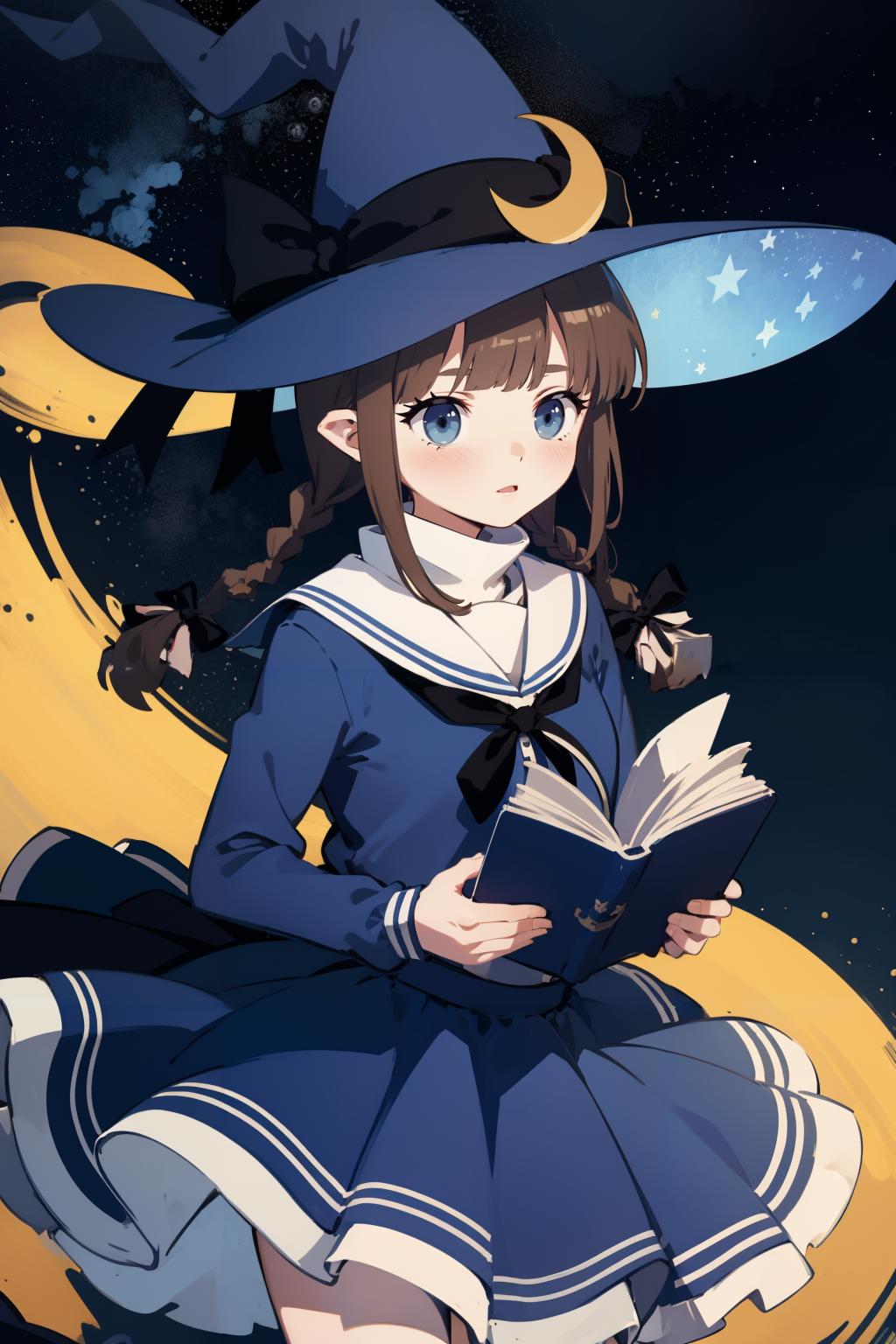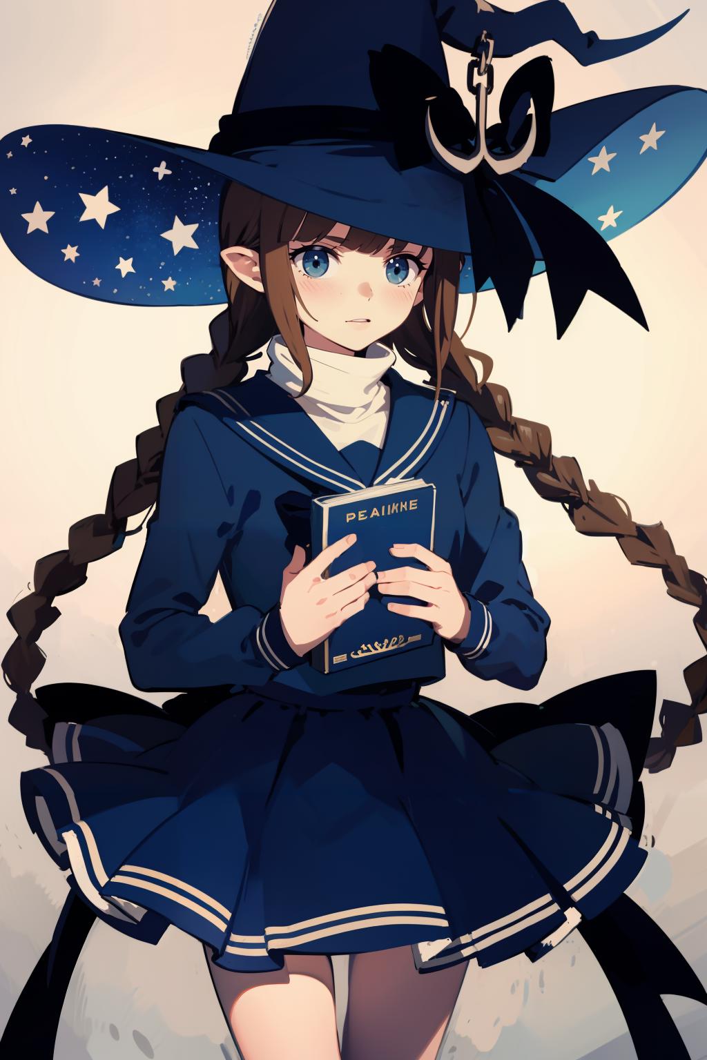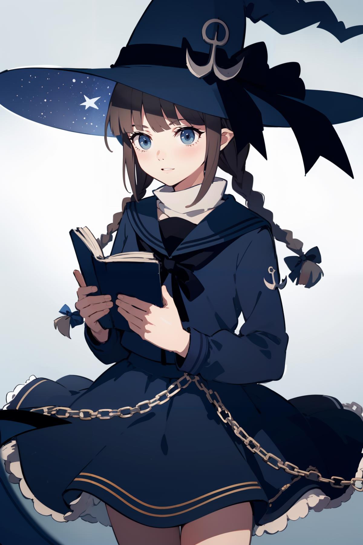 wadablue,twin braids,long hair,witch hat,blue bow,anchor,star print,hat ornament,blue ribbon,book,holding book,blue skirt,chain,star \(symbol\),crescent