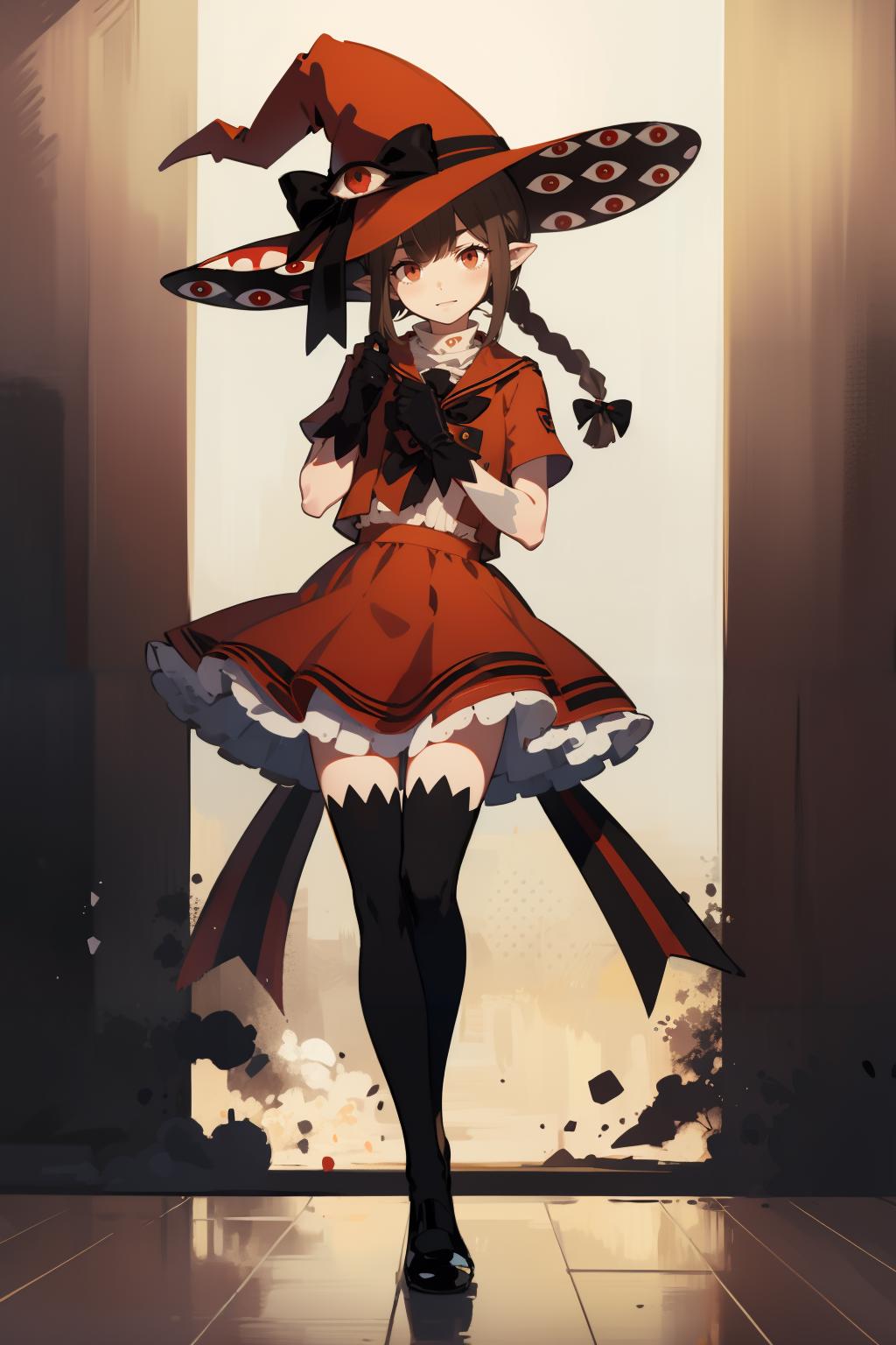 wadared, witch hat,long hair,red bow,extra eyes,eye print,red gloves,black thighhighs,red skirt