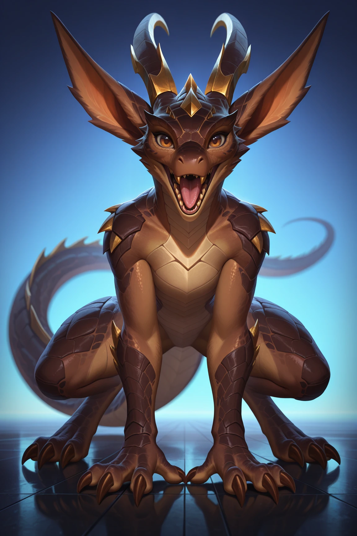 masterpiece, best quality, amazing quality, very aesthetic, high resolution, ultra-detailed, absurdres, newest, scenery, depth of field, scenery, volumetric lighting, smite_x_lol_splash_art, furry, furry female, feral, dragon, scalie, animal ears, animal nose, snout, brown body, brown eyes, narrowed eyes, long ears, tail, claws, brown claws, animal hands, fingers, 3 fingers, animal feet, toes, 3 toes, 1girl, solo, black floor, open mouth, teeth, tongue, looking at viewer, blue background, simple background, gradient backgroundPrompt (Negative)