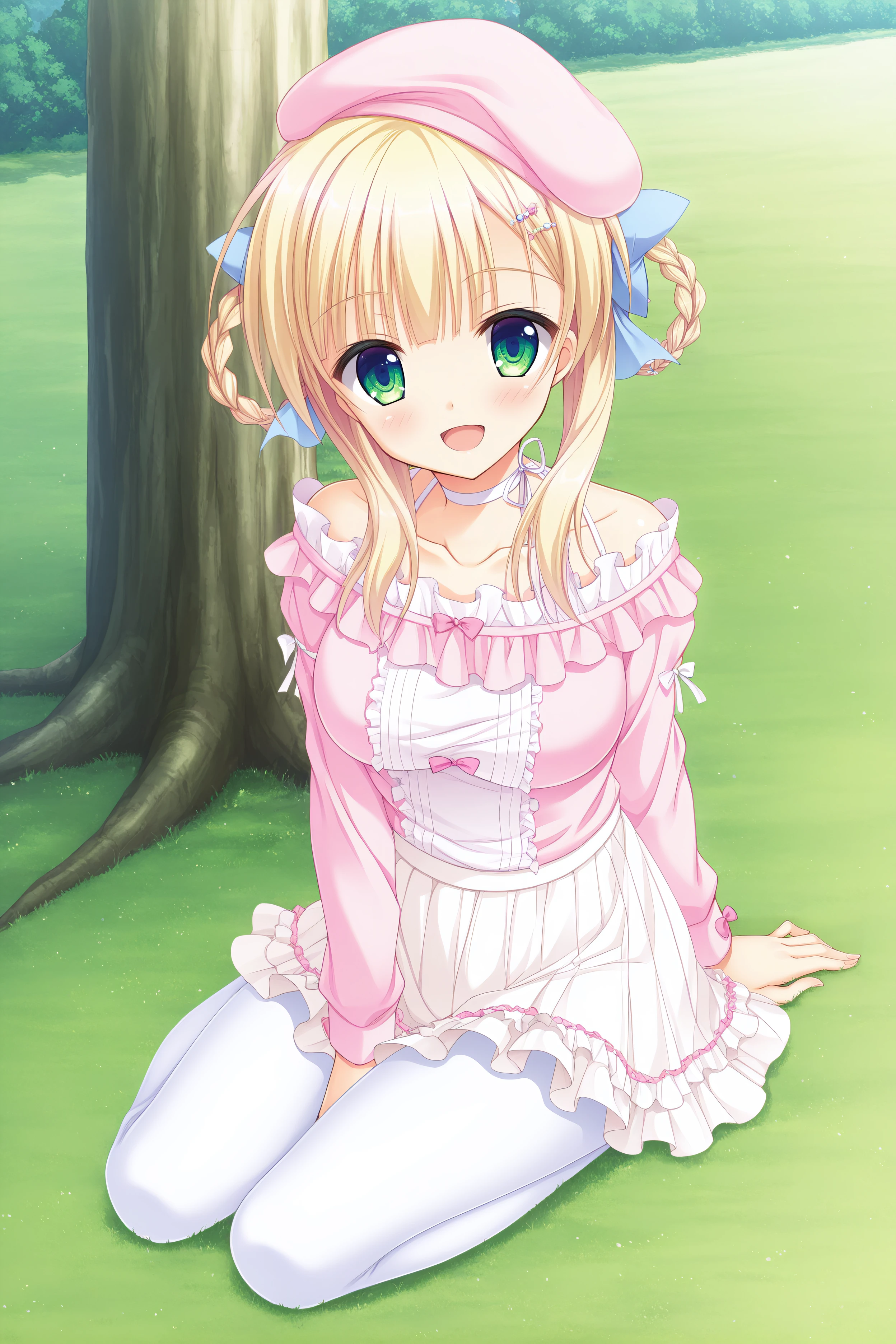 casual_sylvia,short hair, twin braids, braid, hair rings, hair ornament, hair ribbon, large hair ribbon, light_blue_ribbon, back_tied_hair_ribbon, hat, beret, pink_beret, headwear, pink_headwear, long sleeves, frilled shirt, buttoned shirt, pink shirt, bow, pink bows, ribbon shirt, collarbone, skirt, white skirt, pleated skirt, frilled skirt, pantyhose, white pantyhose, breasts, large breasts, white_ribbon_choker,