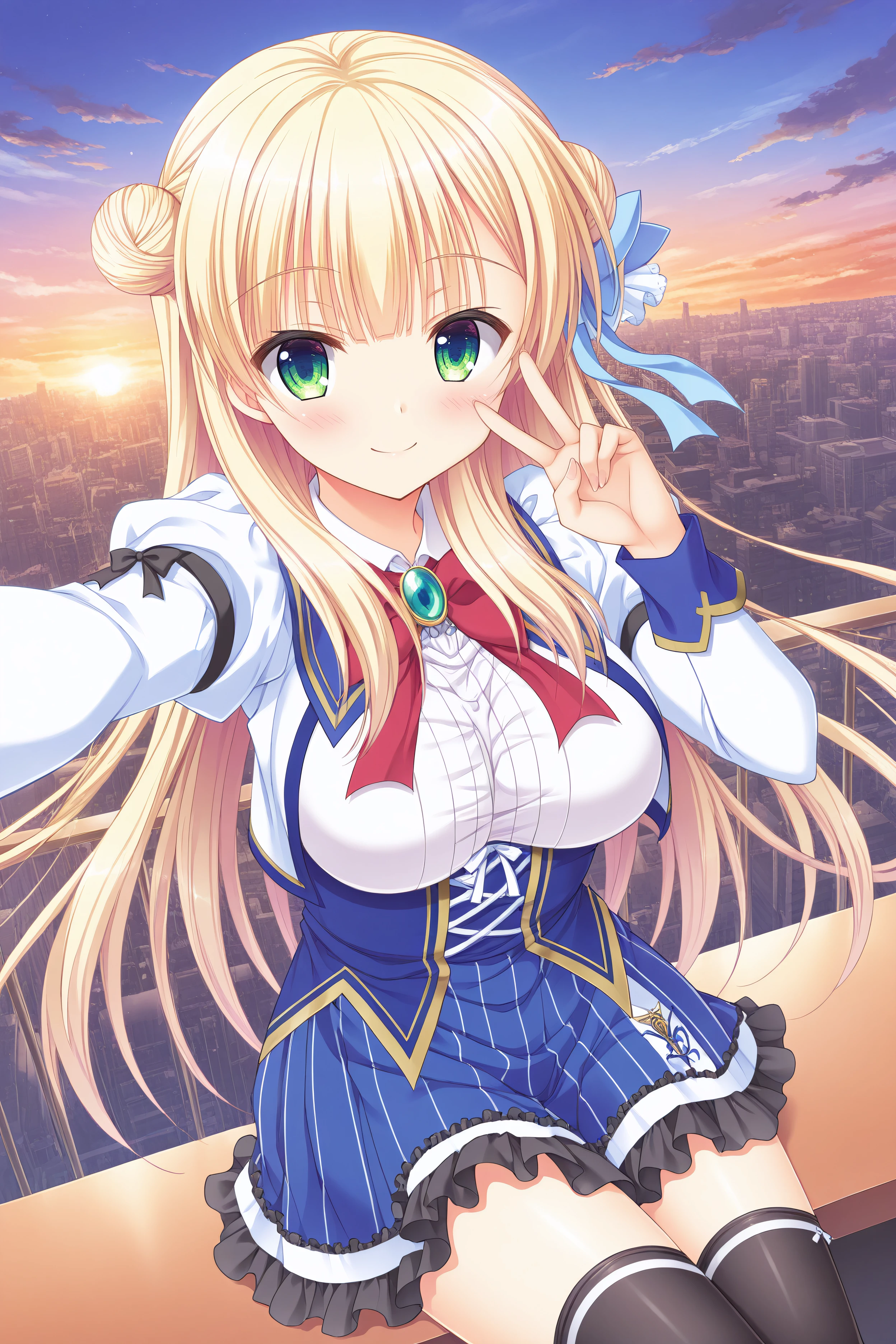uniform sylvia long sleeves, juliet sleeves, large breasts, hair bun, double bun, odango hair, uniform top, blue trim, gold trim, chest bow, red chest bow, pleated skirt, skirt, blue skirt, black frills,black_thighhighs, bow thighhighs, white bow thighhighs, single hair ribbon, right hair ribbon, large hair ribbon, light_blue_hair_ribbon, gemstone ribbon, green gem, decorative ribbon, layered_hair_ribbon,white sleeves,