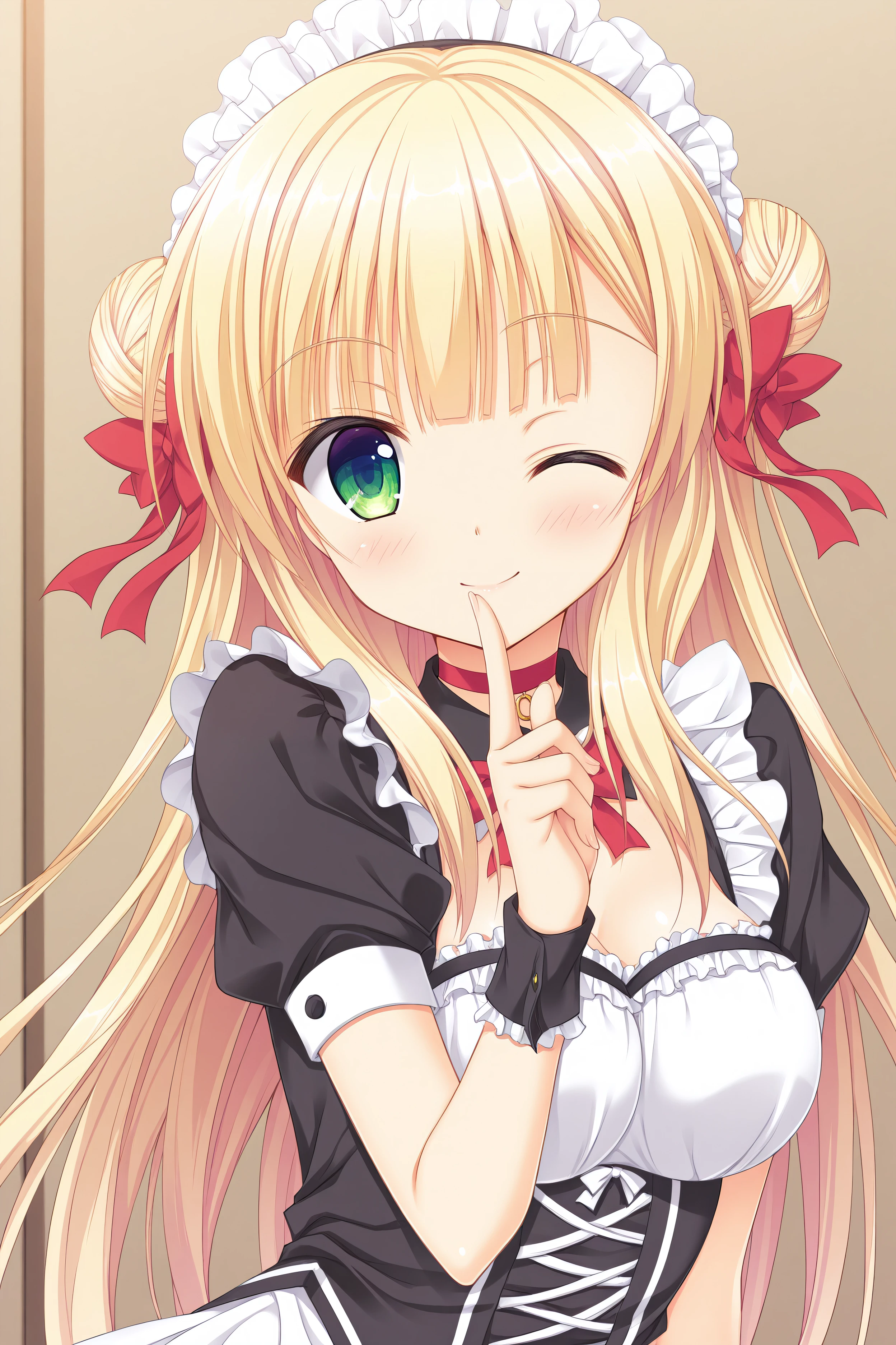 maid sylvia,hair_bun, double_bun, odango_hair,maid_headdress, hair_ribbon, twin_hair_ribbon, red_hair_ribbon, bow_hair_ribbon,, dress, black_dress, apron, white_apron, frilled_apron, puffed_sleeves, short_sleeves, choker, red_ribbon_choker, wrist_cuffs,