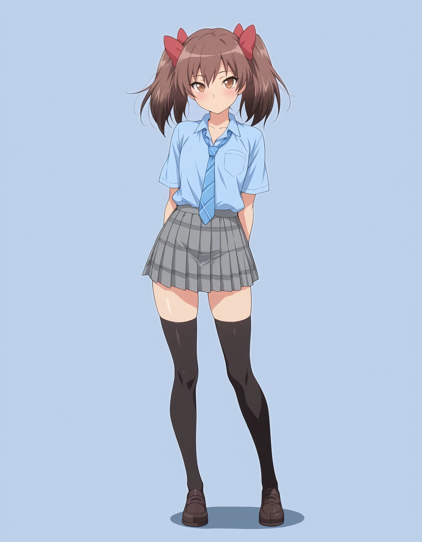 mai_k5td,mai_btggk5t,long_hair,twintails,brown_hair,brown_eyes,hair_bow,school_uniform,blue_shirt,blue_necktie,grey_pleated_skirt,short_skirt,black_thighhighs,loafersNatsu Hyuuga 日向 夏都