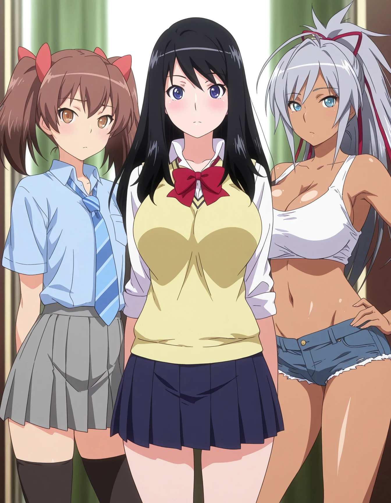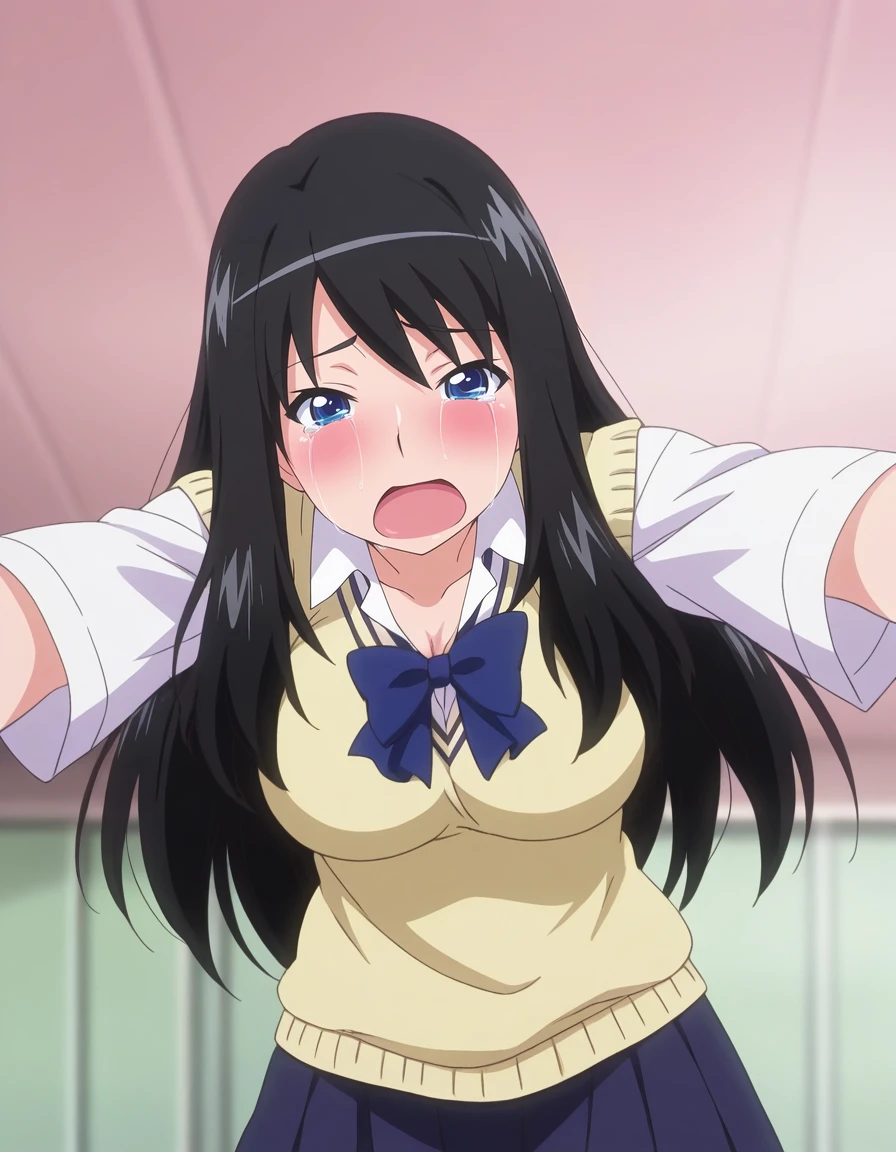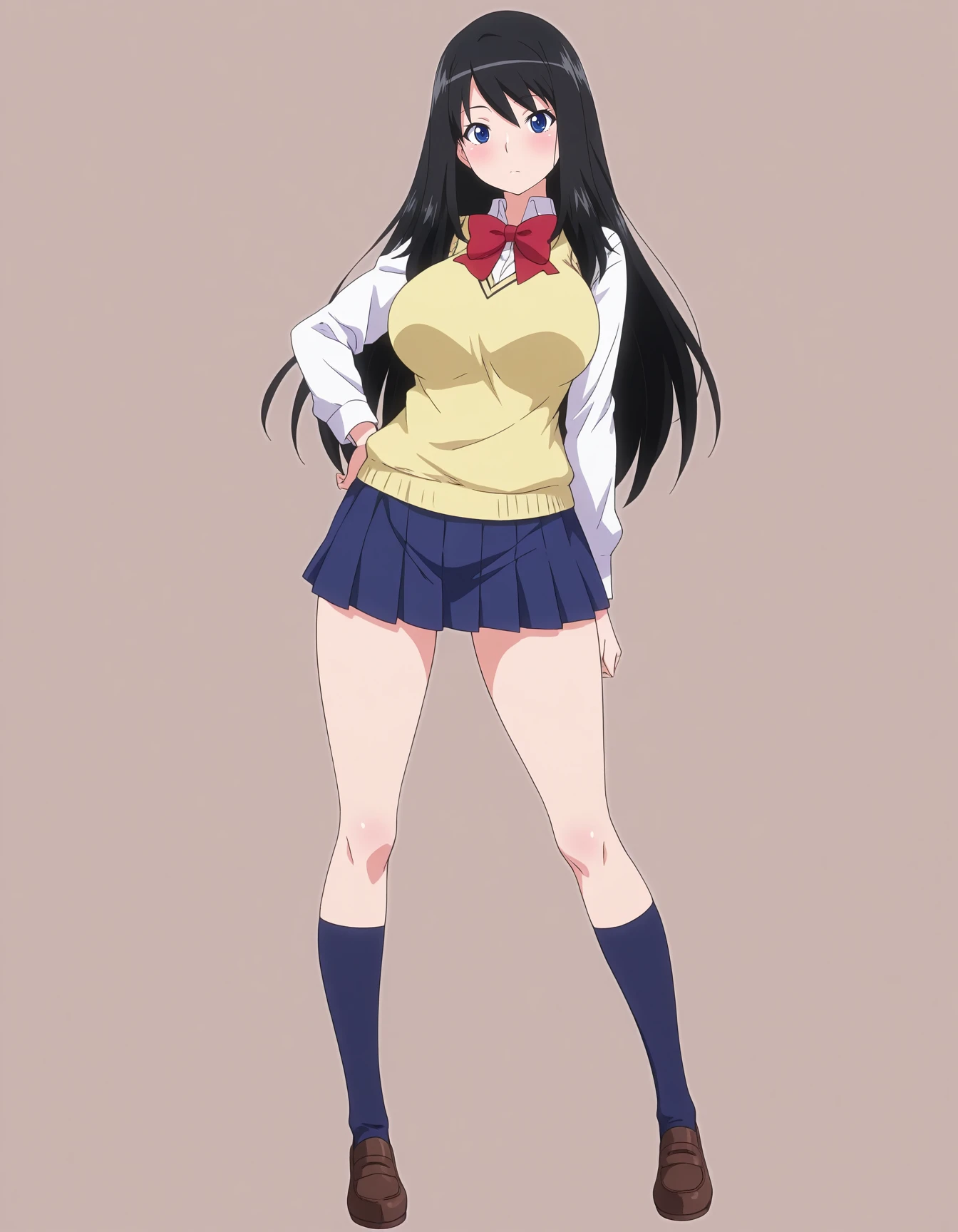 mai_k5td,mai_akarik5t,long_hair,black_hair,blue_eyes,school_uniform,red_bowtie,yellow_vest,white_shirt,long_sleeves,blue_pleated_skirt,short_skirt,blue_socks,loafersAiri Hanazawa 花沢 愛梨
