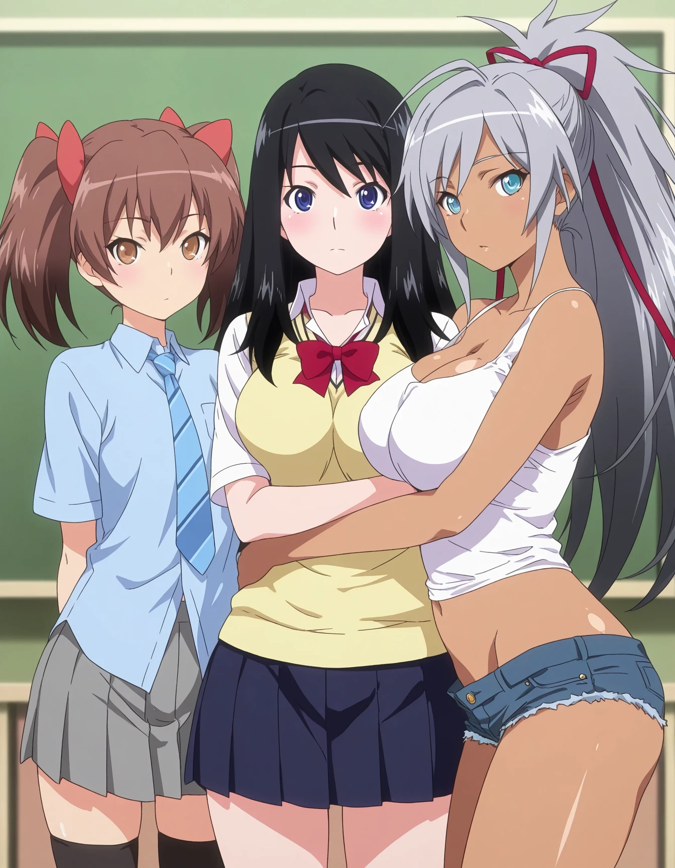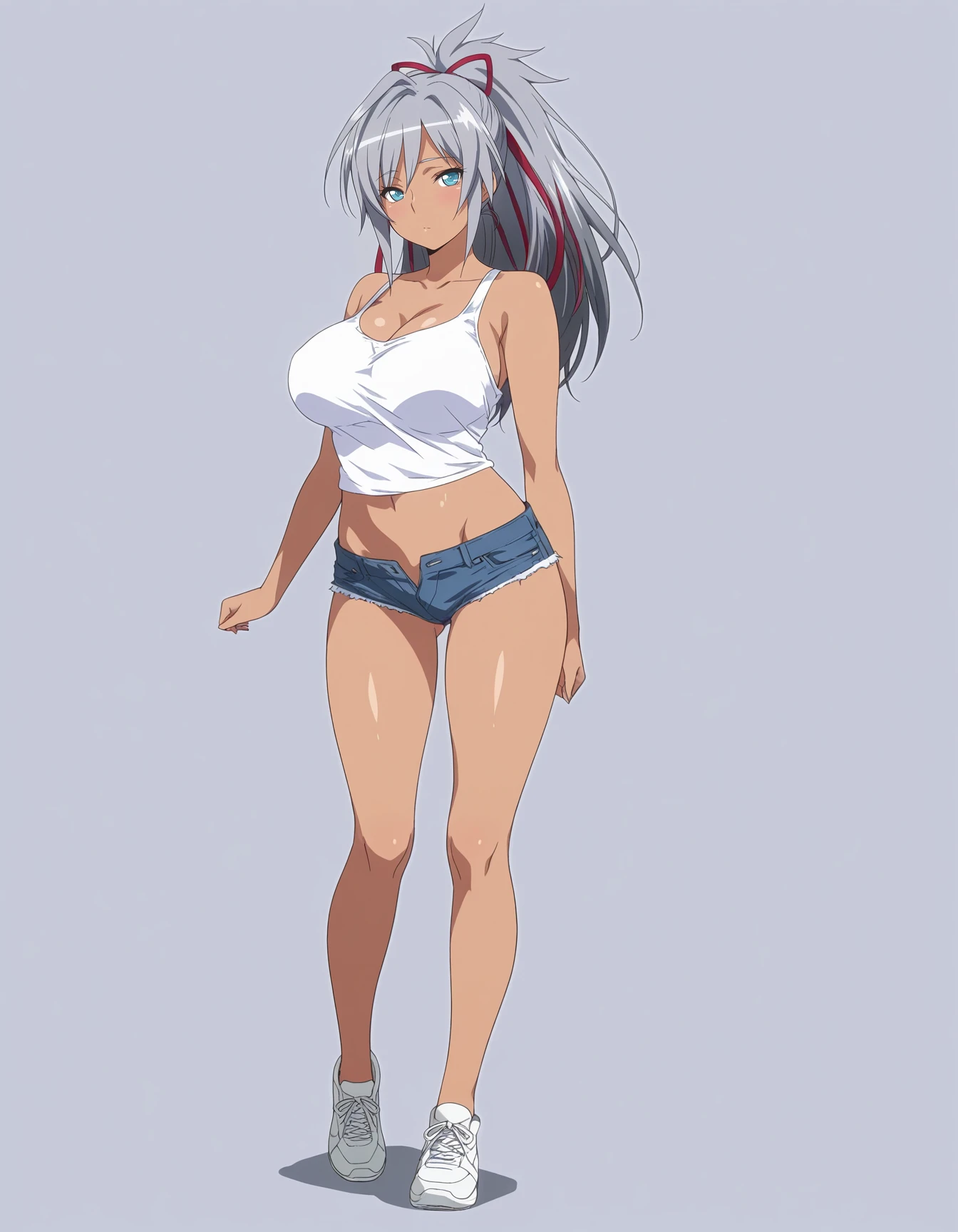 mai_k5td,mai_natsuk5t,dark-skinned_female,long_hair,ponytail,grey_hair,blue_eyes,large_breasts,hair_ribbon,white_tank_top,midriff,denim_shorts,micro_shorts,open_fly,sneakersUsing the prompt 'mai_k5td, anime_coloring' can obtain the style of the work.