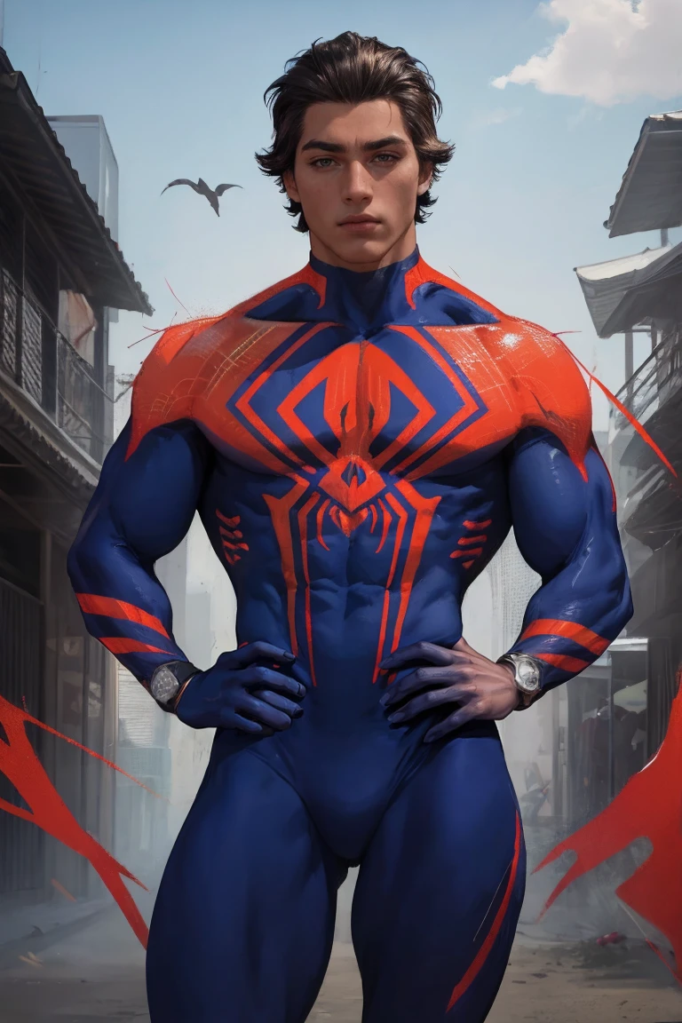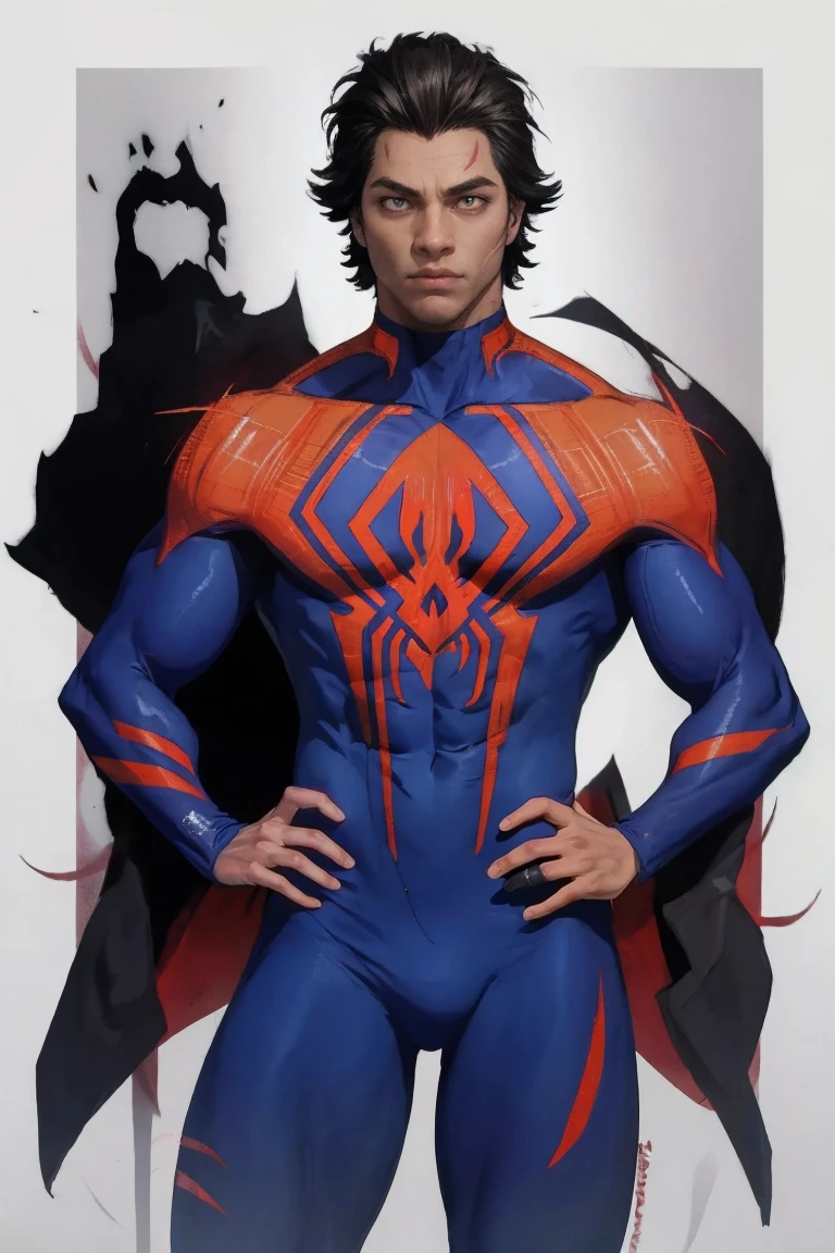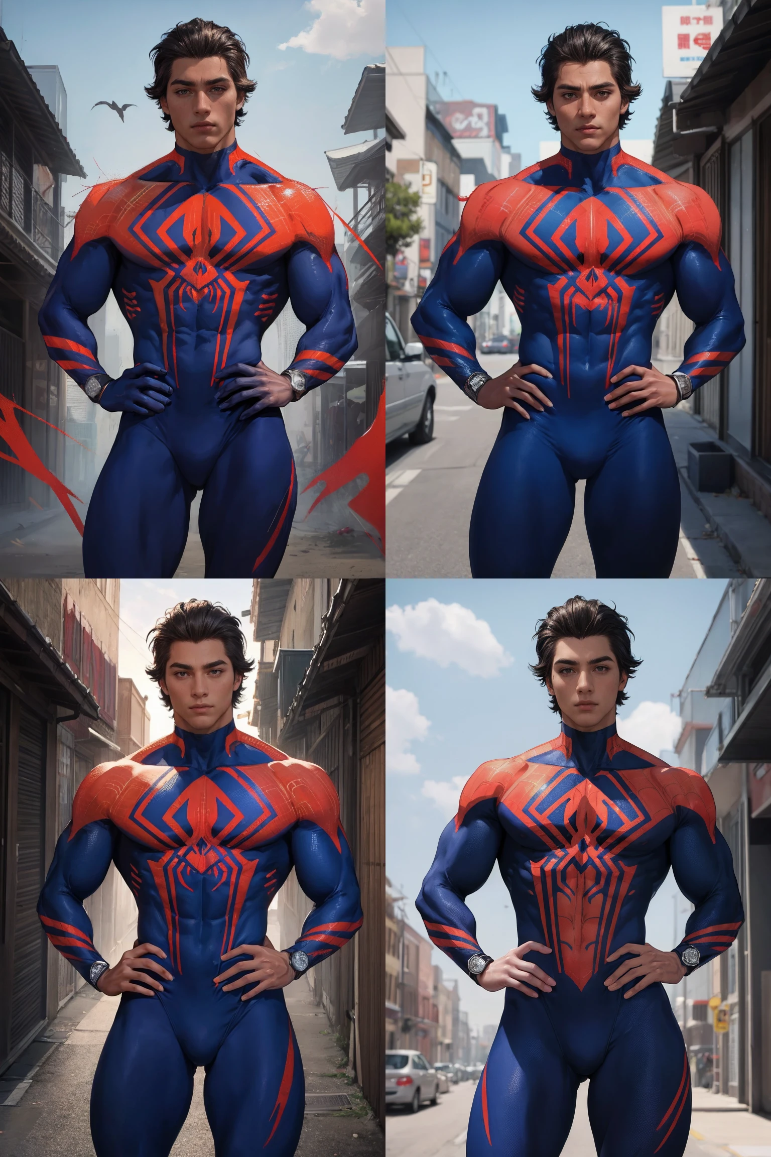 bodysuit, superhero, blue bodysuit, red bodysuit, spider web print, skin tight, spider web,