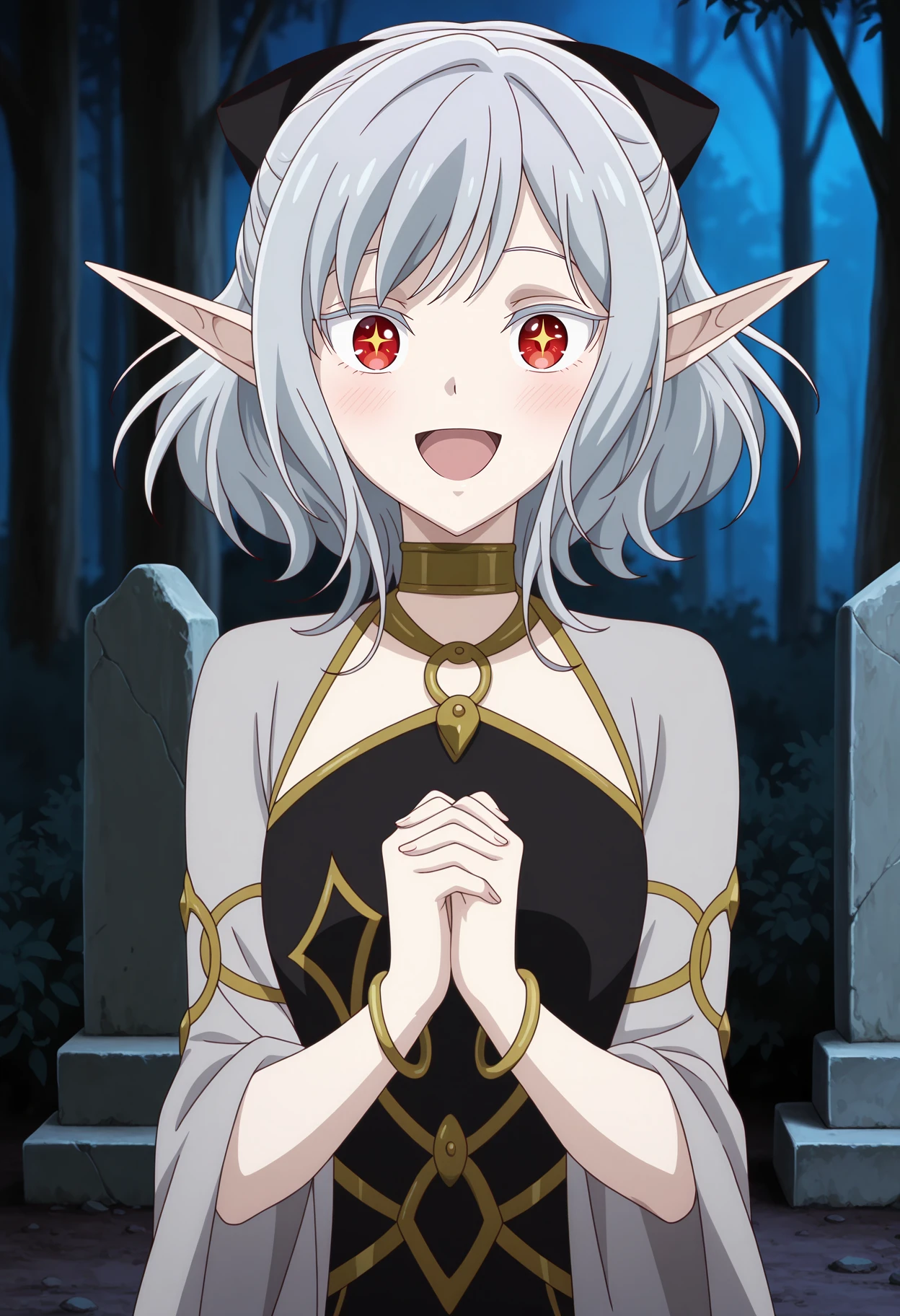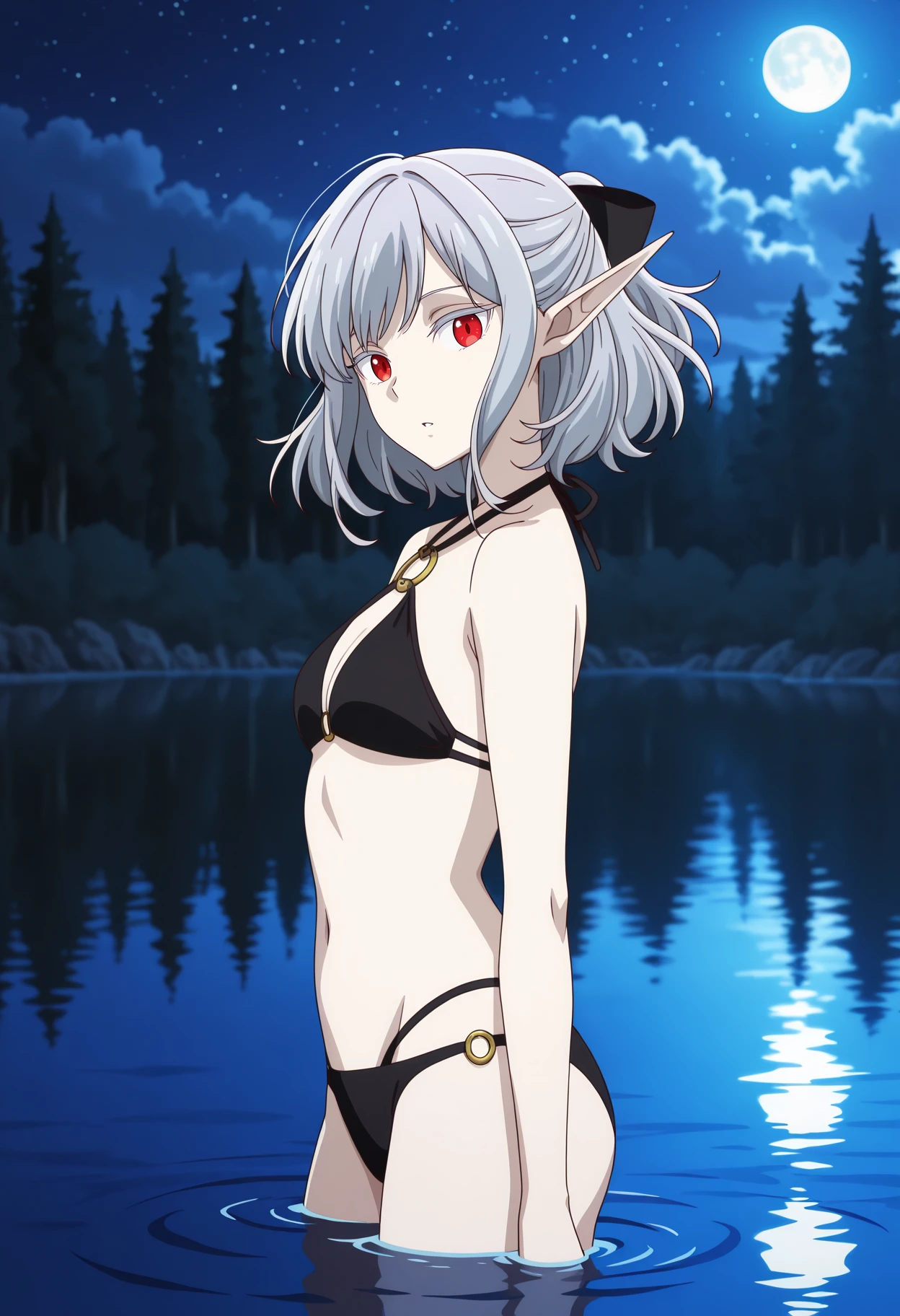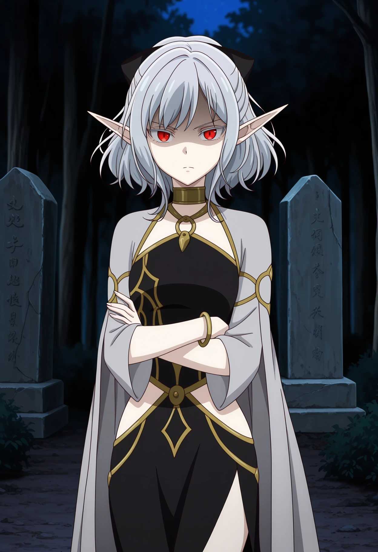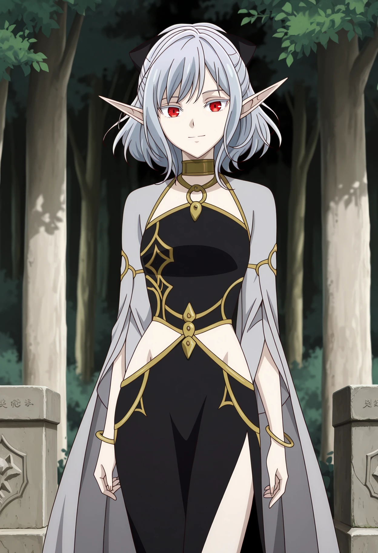 half updo, medium hair, grey hair, red eyes, colored eyelashes, long pointy ears, hair bow, black bow, pale skin
