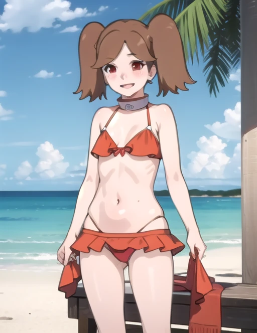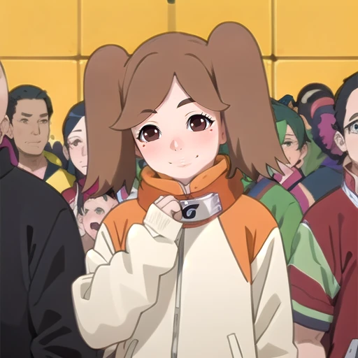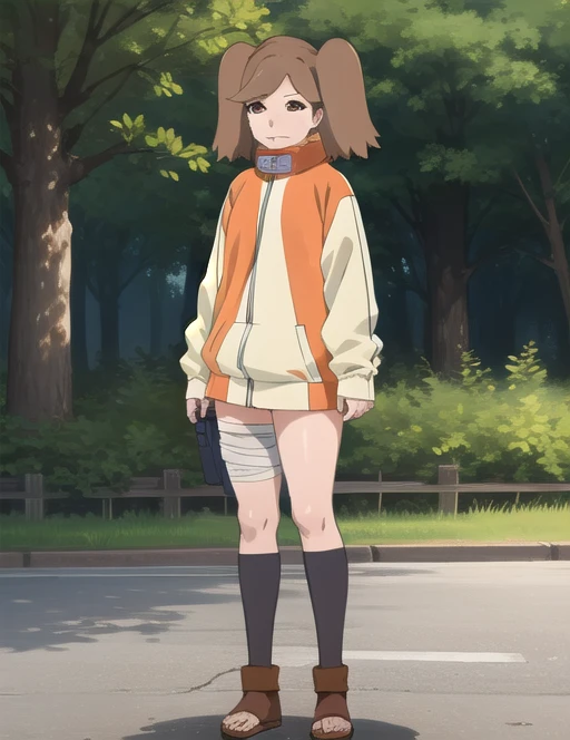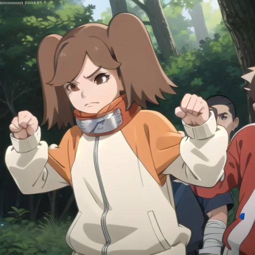 Trigger: namida suzumeno, two braids,brown hair,brown eyes,orange jacket,bandage