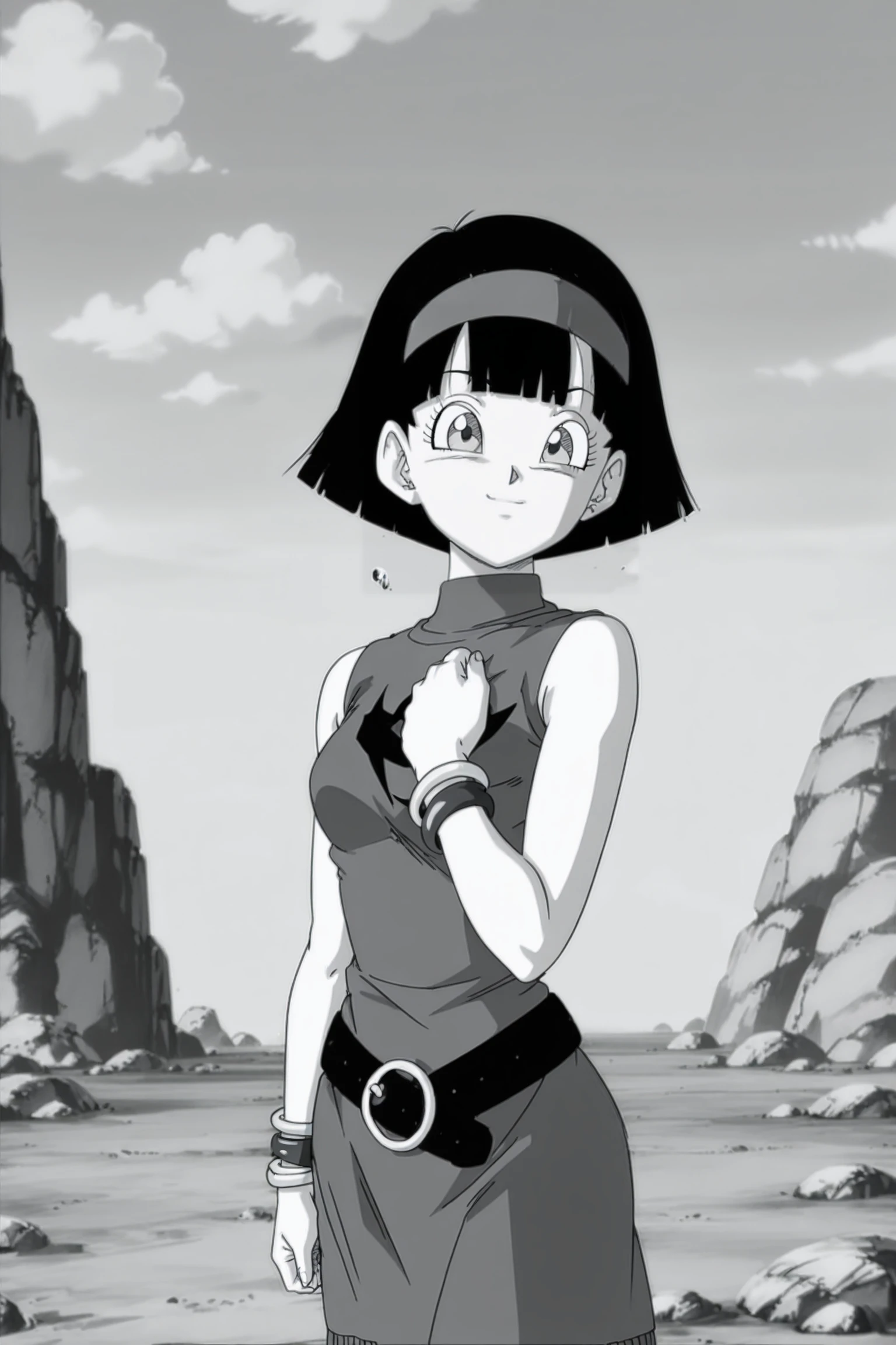 videl, end of z, very short hair, bowl cut, black hair, bangs, blue eyes,
