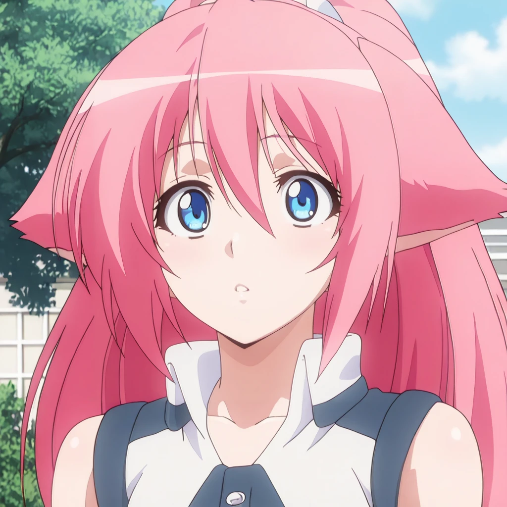 1girl, solo, C4m_C4stin, long_hair,pink_hair, blue_eyes, large_breasts, midriff, revealing_clothes, maebari, crotch_plate, strapless_bottom, leg_warmers, white_footwear, official_style, anime_coloring