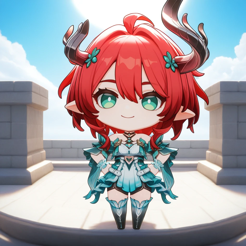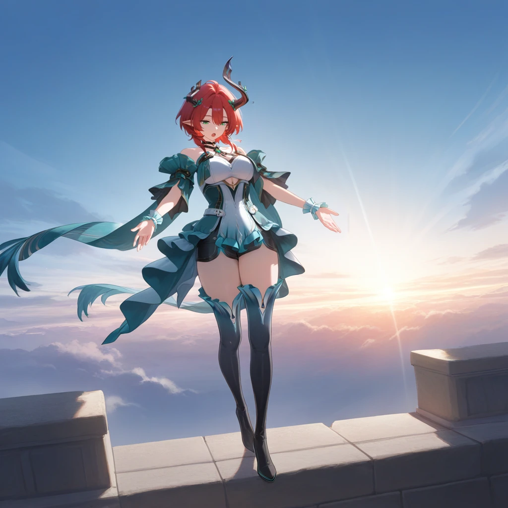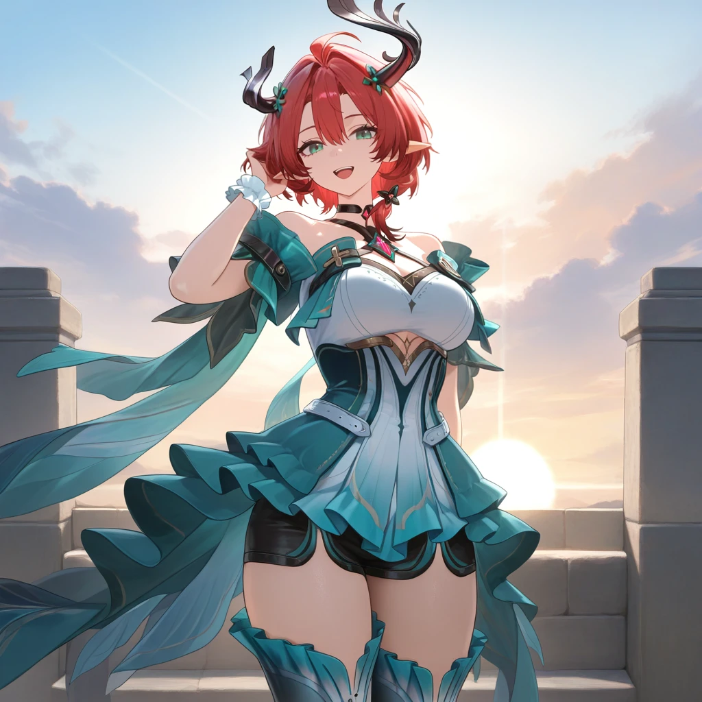 Ciaccona, green eyes, pointy ears, red hair, short hair, asymmetrical horns, hair ornament, side ponytail, short dress, frilled wrist cuffs, white wrist cuffs, white dress, multicolored dress, teal dress, gem, off-shoulder dress, bare shoulders, teal sleeves, short sleeves, wide sleeves, see-through sleeves, layered sleeves, clothing cutout, thigh boots, frilled footwear, gradient boots, gradient skirt, white skirt, frilled skirt, teal skirt, black shorts, short shorts, shorts under skirt, white belt, jewelry, halterneck, black choker,P.S: Only made this LoRA, because she has a nice outfit. I don't even know who she is, I stopped playing WuWa and gachas in general. (Hi3 is an exception obviously)
