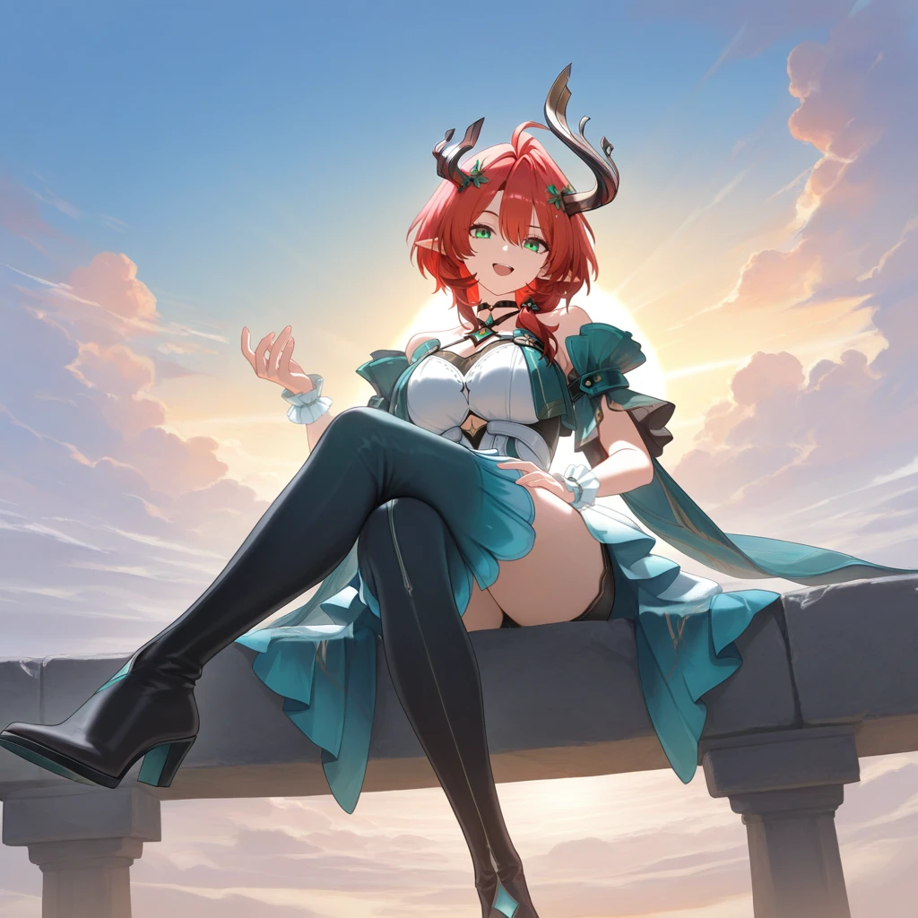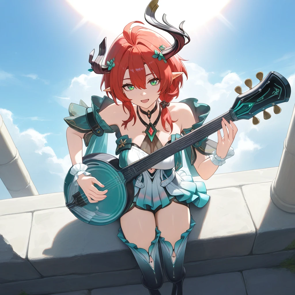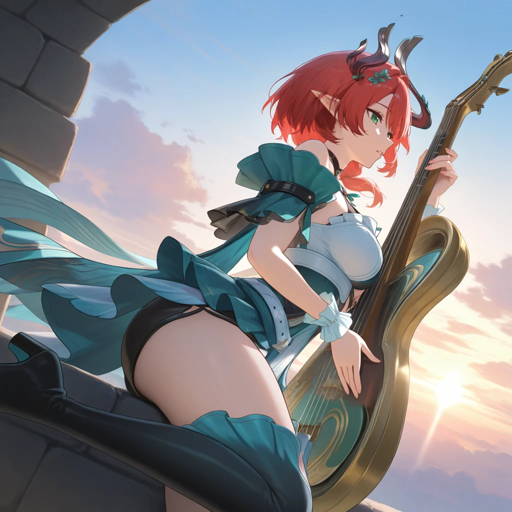 Ciaccona, green eyes, pointy ears, red hair, short hair, asymmetrical horns, hair ornament, side ponytail, short dress, frilled wrist cuffs, white wrist cuffs, white dress, multicolored dress, teal dress, gem, off-shoulder dress, bare shoulders, teal sleeves, short sleeves, wide sleeves, see-through sleeves, layered sleeves, clothing cutout, thigh boots, frilled footwear, gradient boots, gradient skirt, white skirt, frilled skirt, teal skirt, black shorts, short shorts, shorts under skirt, white belt, jewelry, halterneck, black choker,P.S: Only made this LoRA, because she has a nice outfit. I don't even know who she is, I stopped playing WuWa and gachas in general. (Hi3 is an exception obviously)
