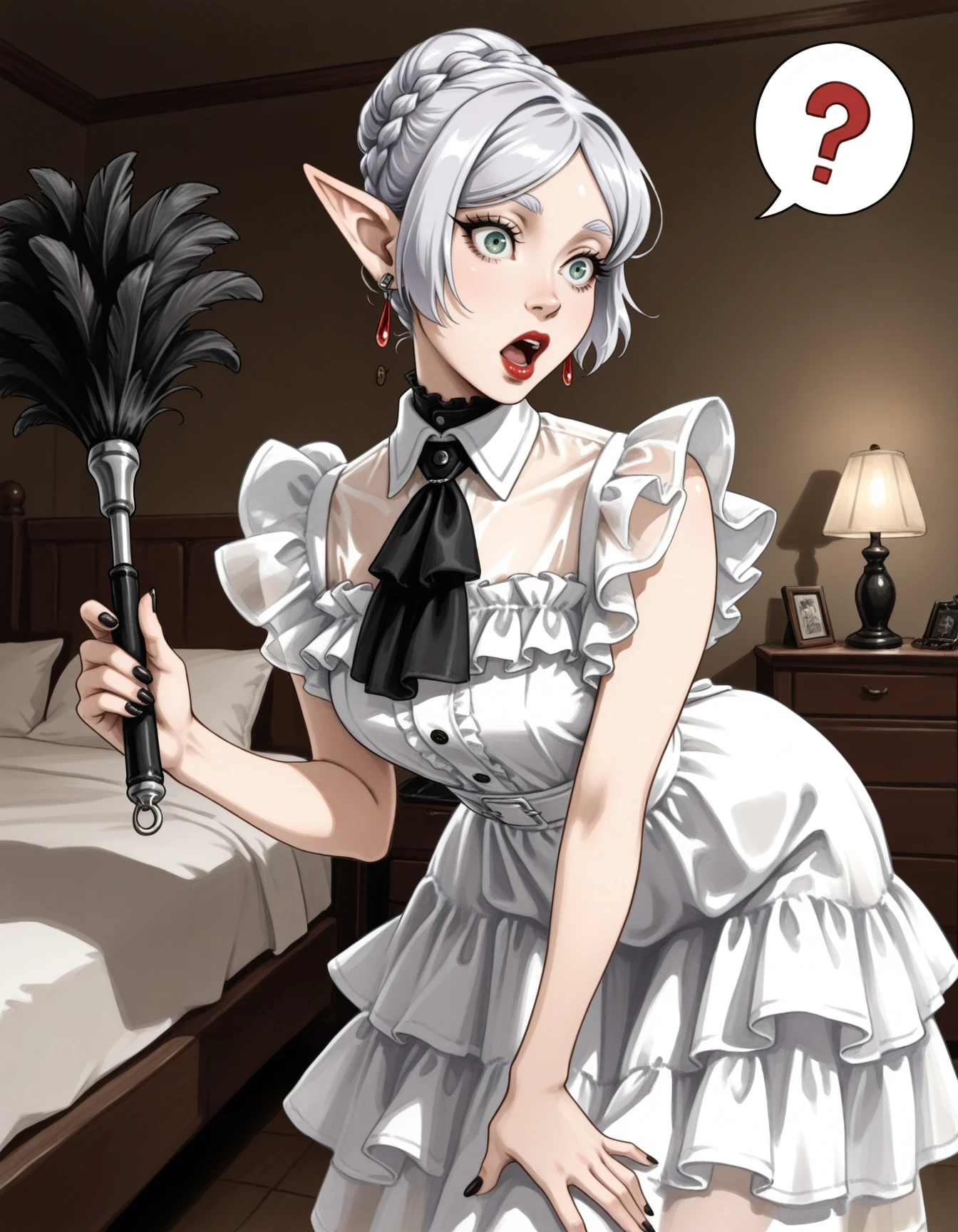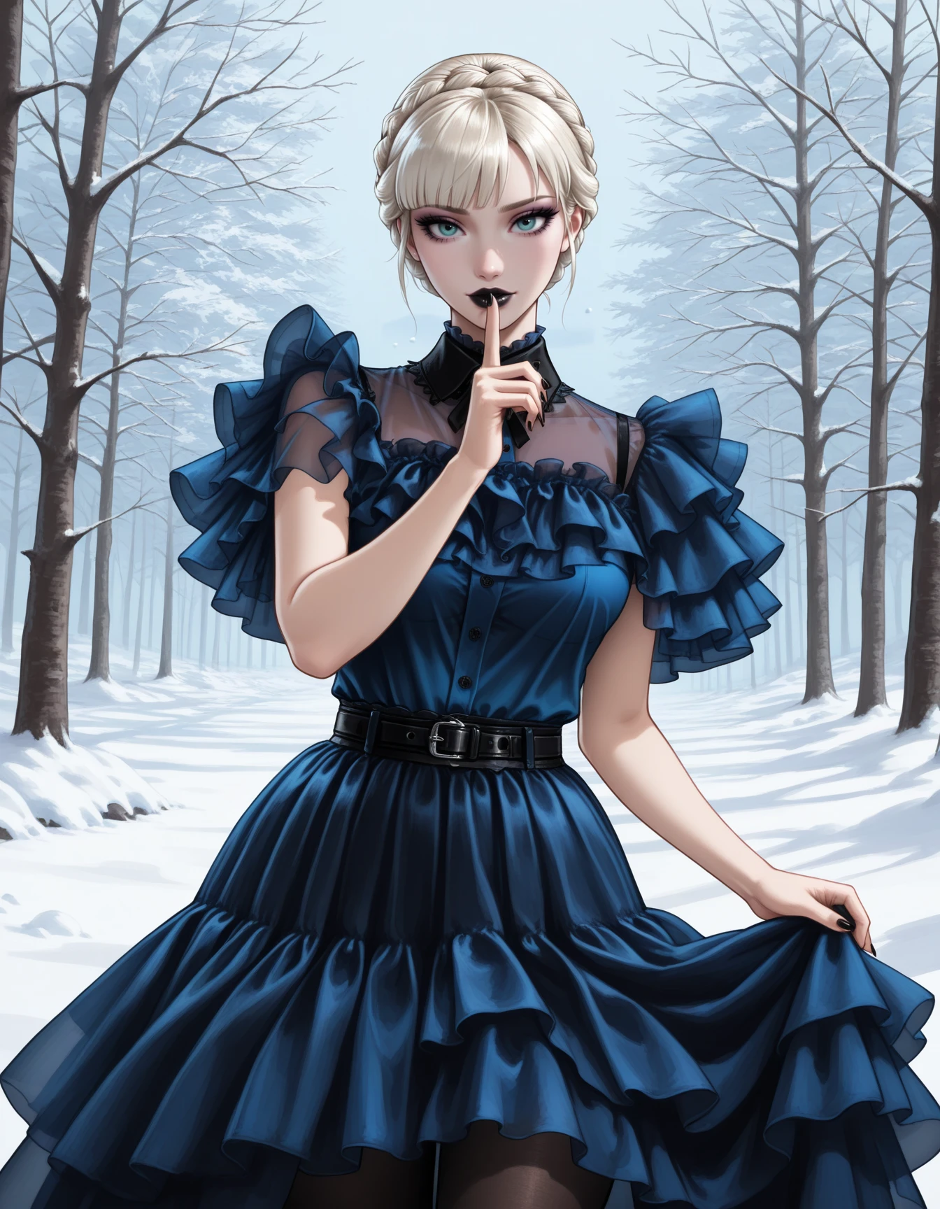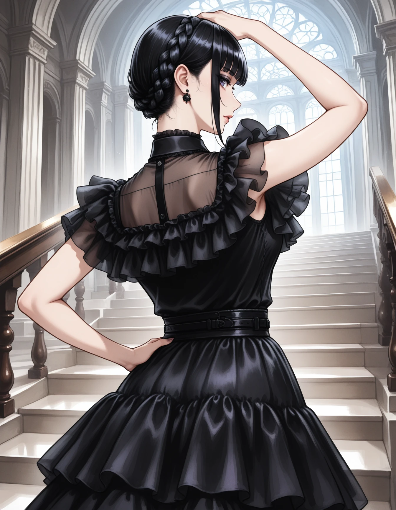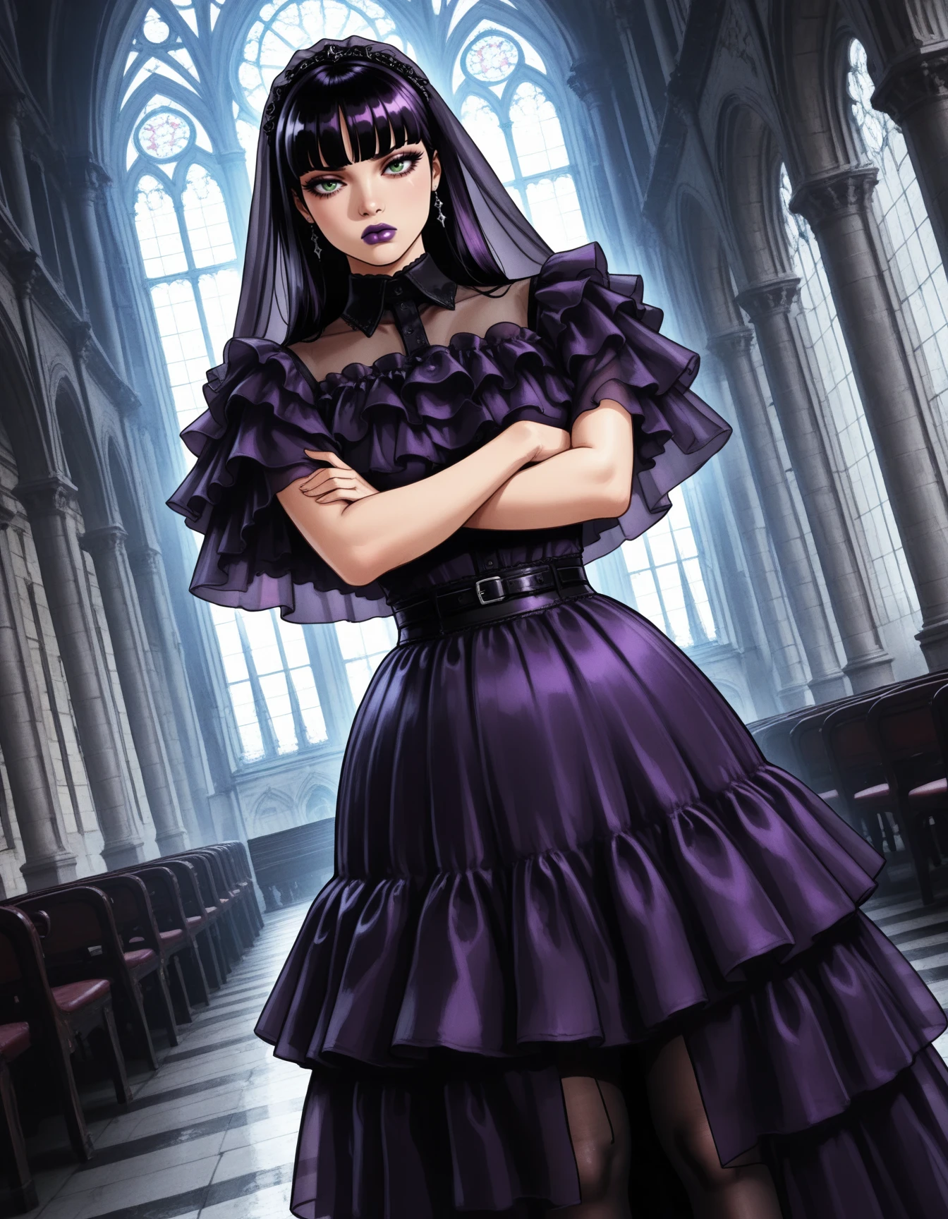 goth, too many frills, black dress, bare arms, detached collar, (dark see-through button shirt), buckle, layered skirt