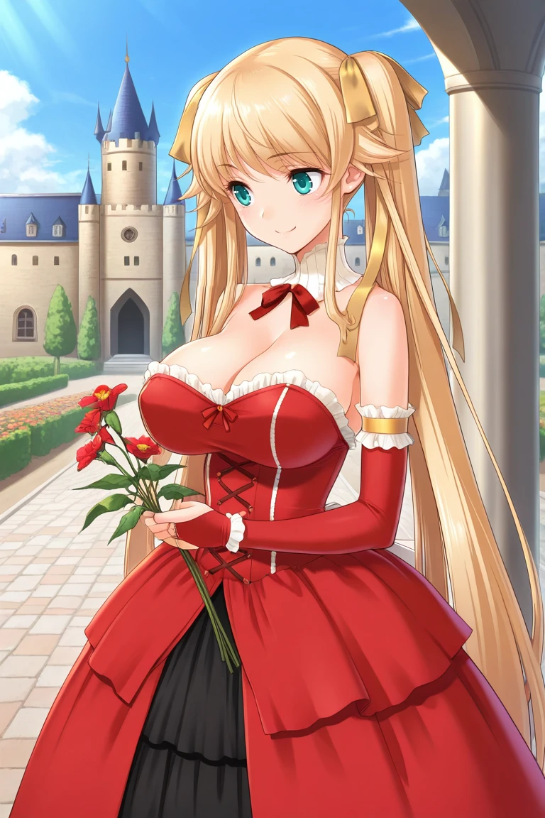 princess outfit4, red dress, strapless dress, cleavage, detached collar, black underskirt, bridal gauntlets,
