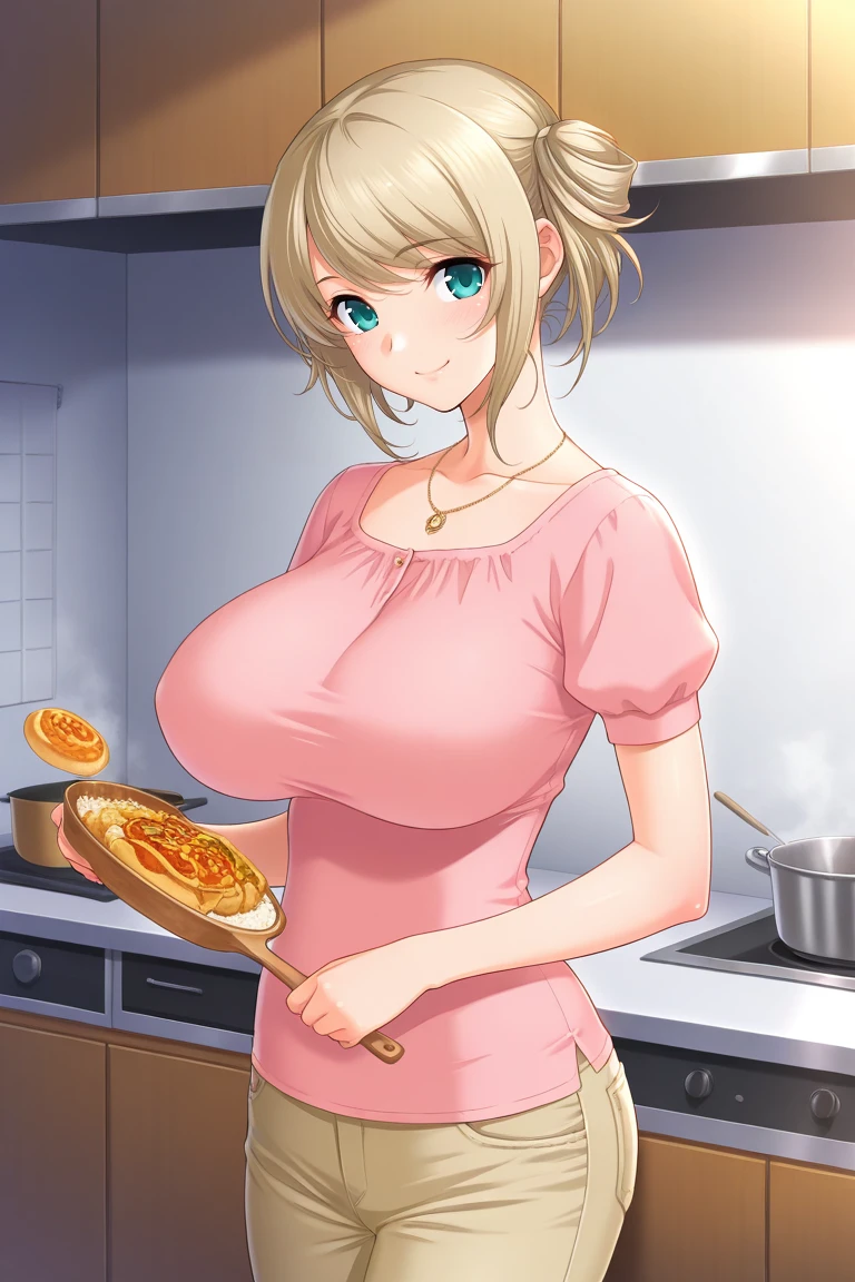 vanilla-hime, medium hair, blond hair, updo, double buns, aqua eyes, large breasts,