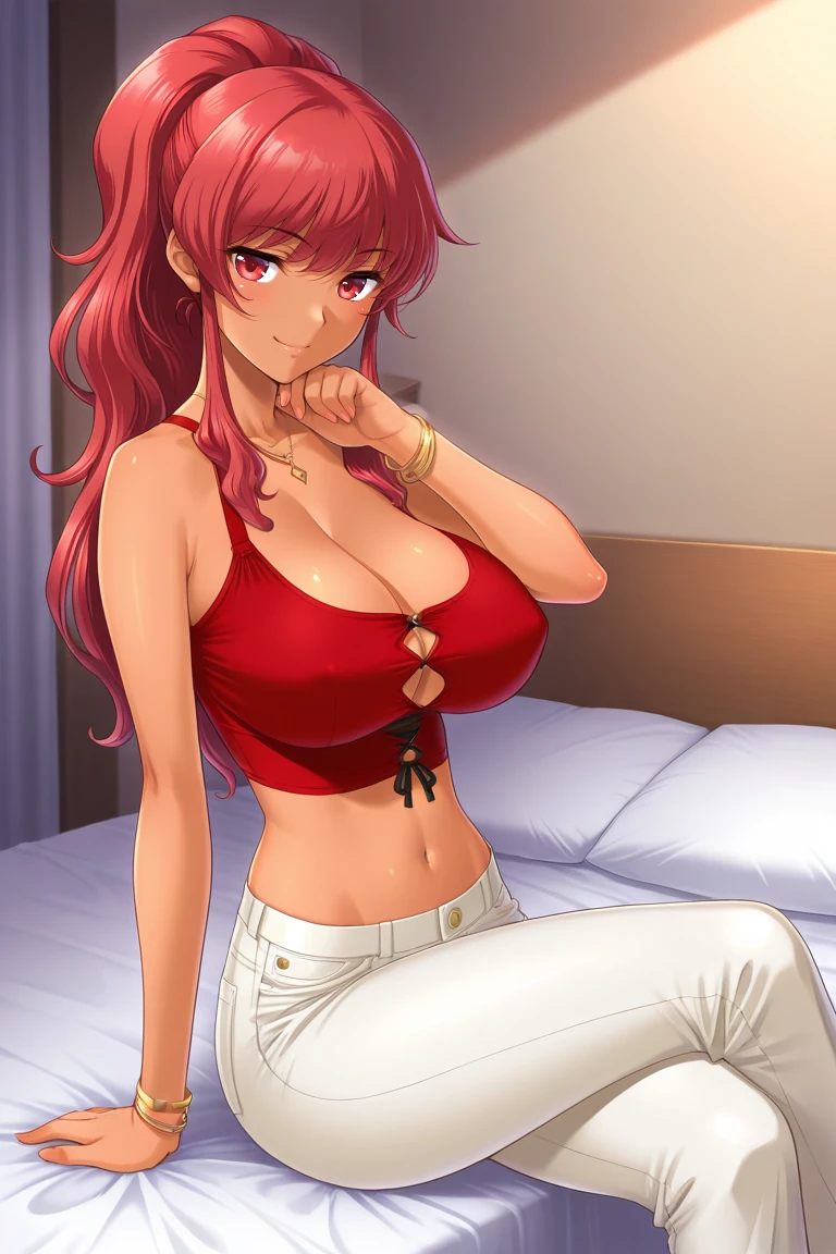 casual outfit, red shirt, crop top, sleeveless, cleavage, midriff, white pants, jewelry, bracelet,
