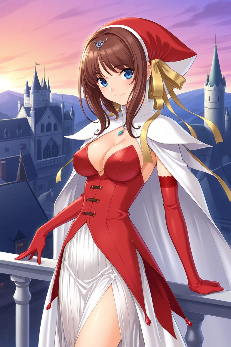 princess outfit5, red dress, white cape, white skirt, red elbow gloves, red hat, cleavage,