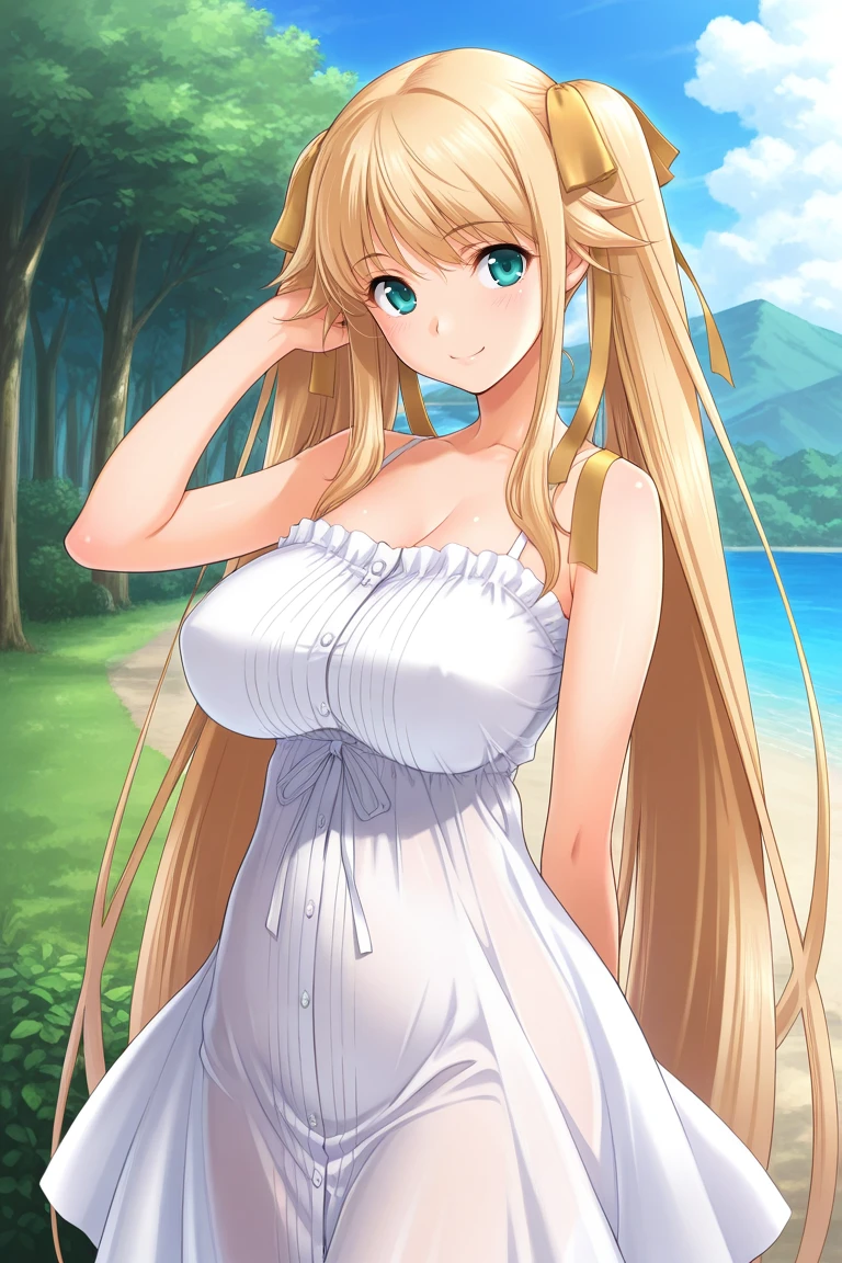 milk-hime, blond hair, twintails, ribbon, very long hair, bangs, aqua eyes, large breasts,