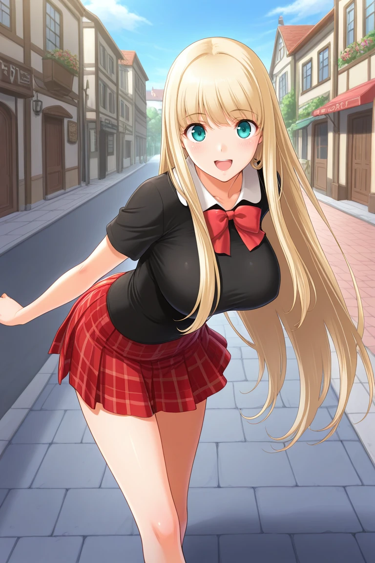 casual outfit2, uniform, black shirt, short sleeves, red bow, red skirt, plaid skirt,