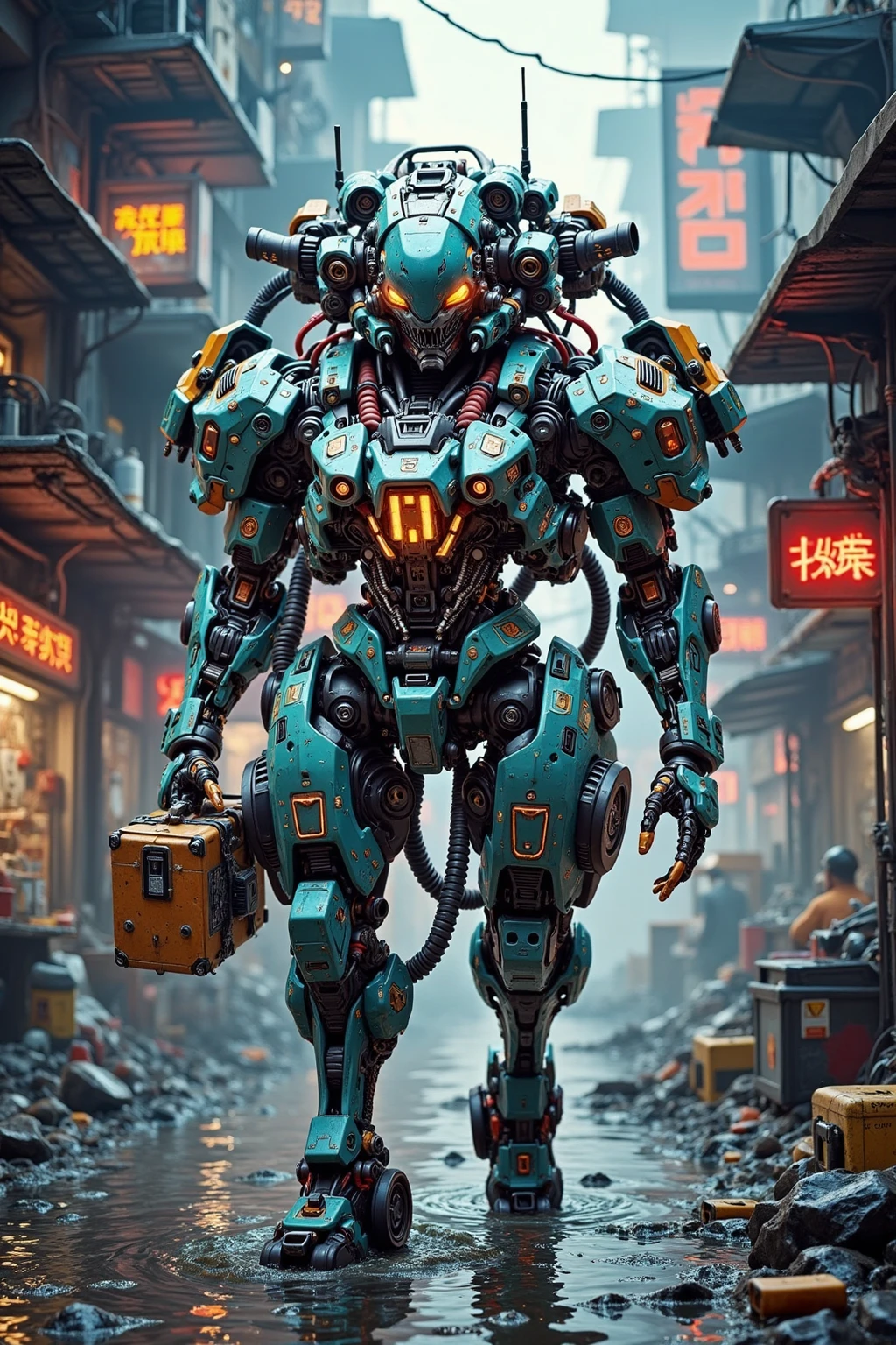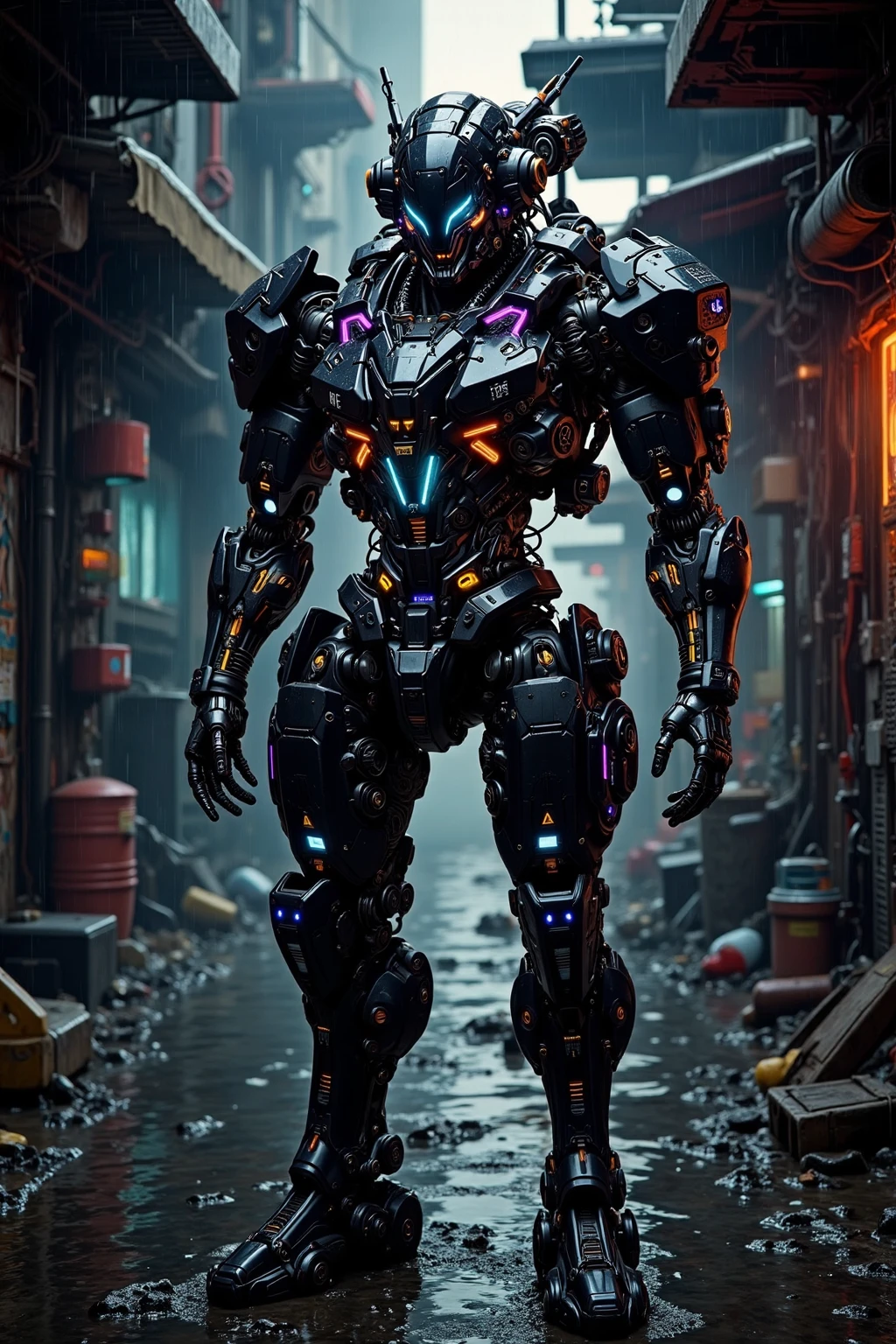 Cyberpunk - themed robotic designs, a sleek black mech with neon - lit accents, standing in a rain - soaked alley of a dystopian city.