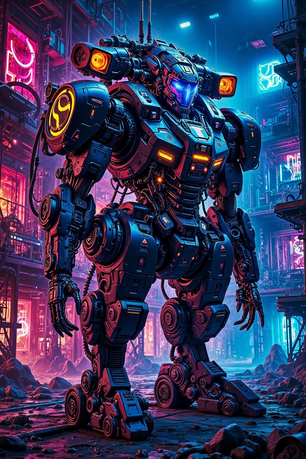 Cyberpunk - themed robotic designs, a large robotic construction vehicle with laser cutters, working on a skyscraper in a neon - drenched cyber city.