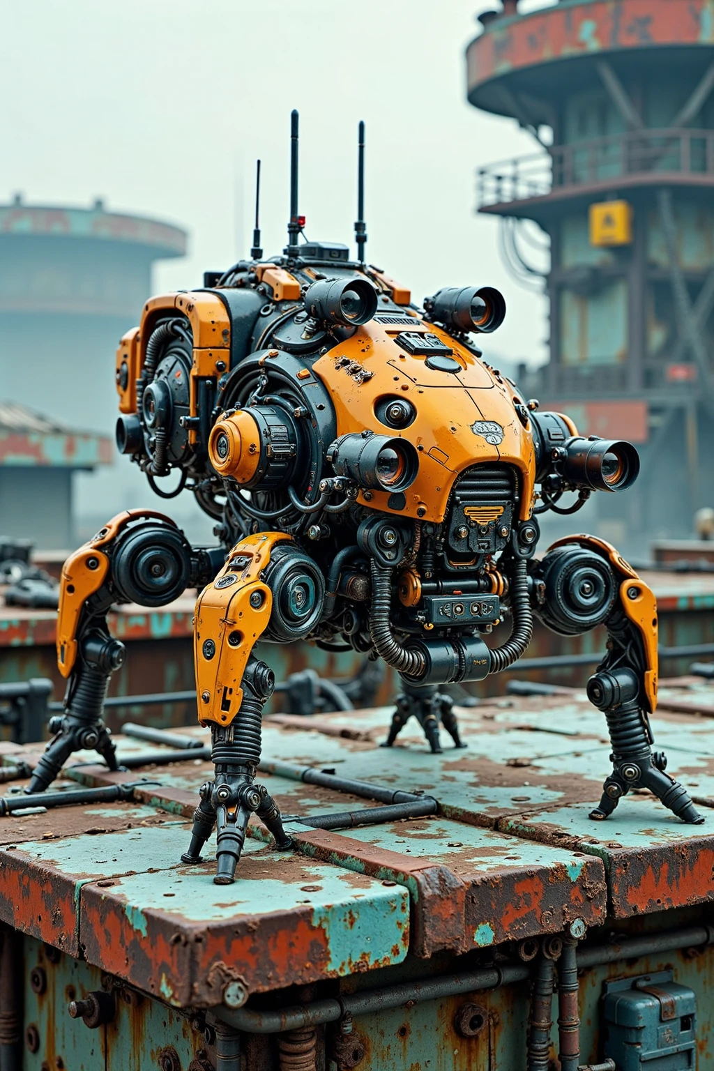 Cyberpunk - themed robotic designs, a small robotic spider with surveillance cameras, scurrying across a rusted cyber rooftop.