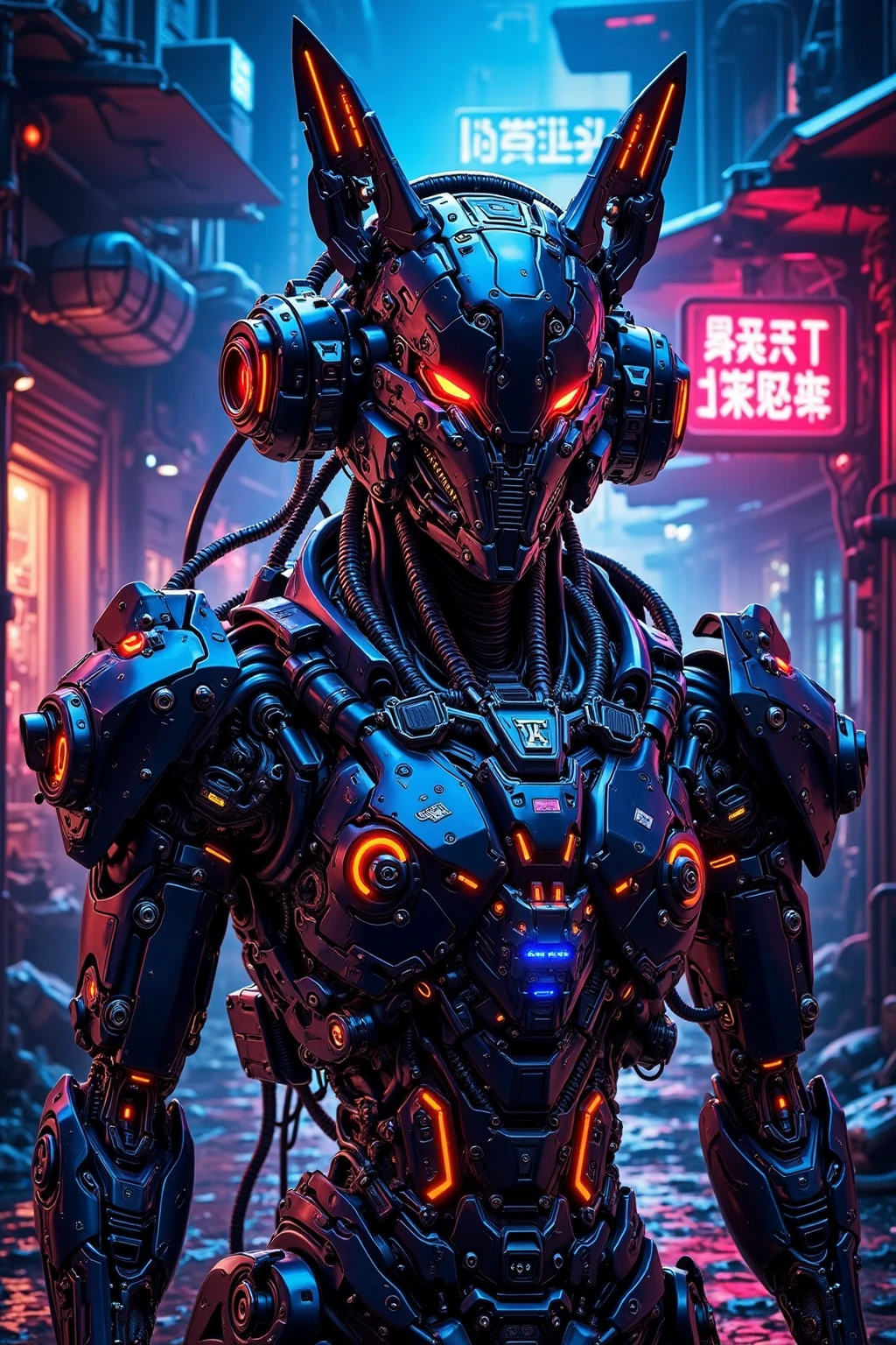 Cyberpunk - themed robotic designs, a robotic dog with glowing red eyes, patrolling a neon - filled cyber street, equipped with high - tech weaponry.