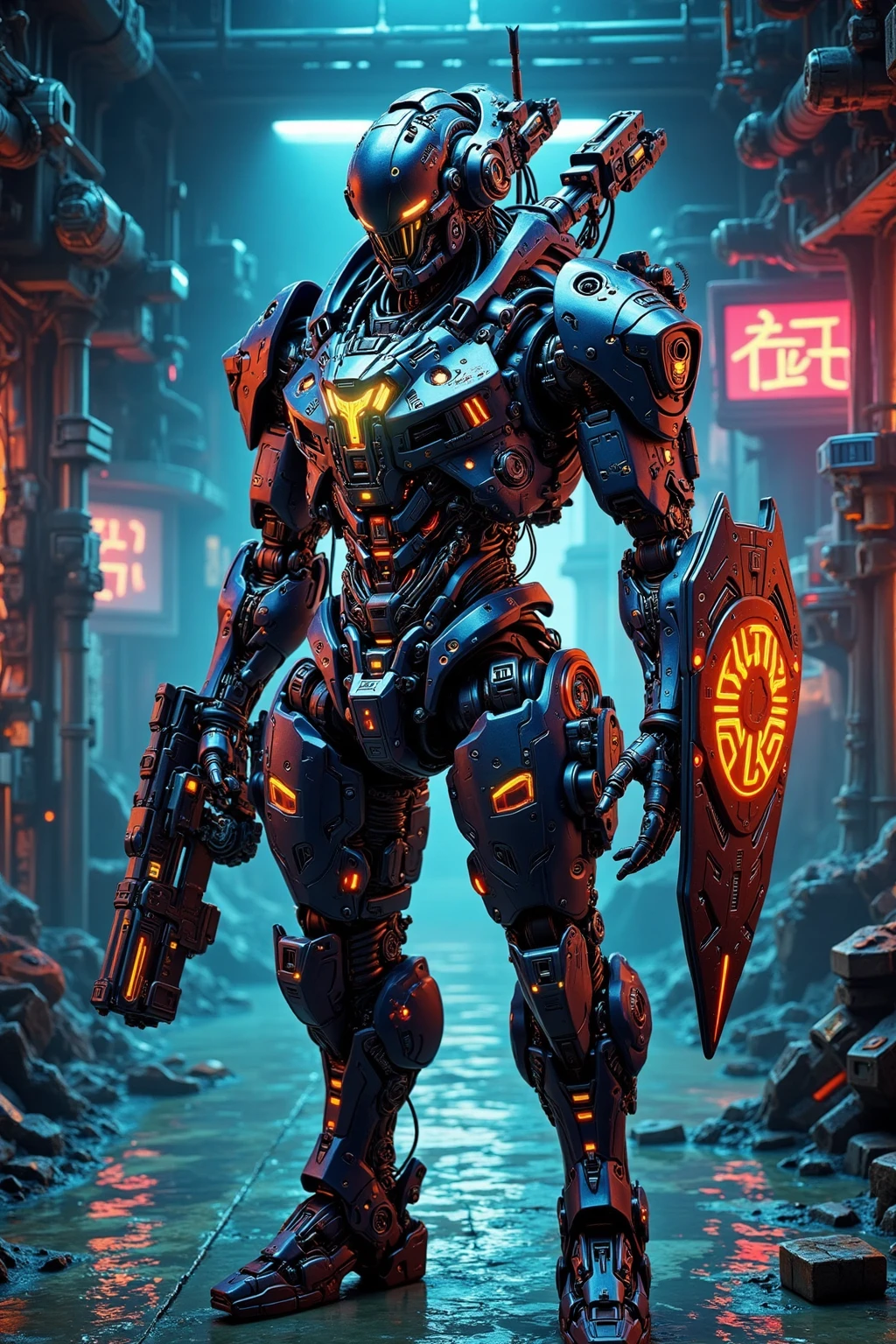 Cyberpunk - themed robotic designs, a robotic security guard with a shield and stun gun, standing at the entrance of a cyber corporation.