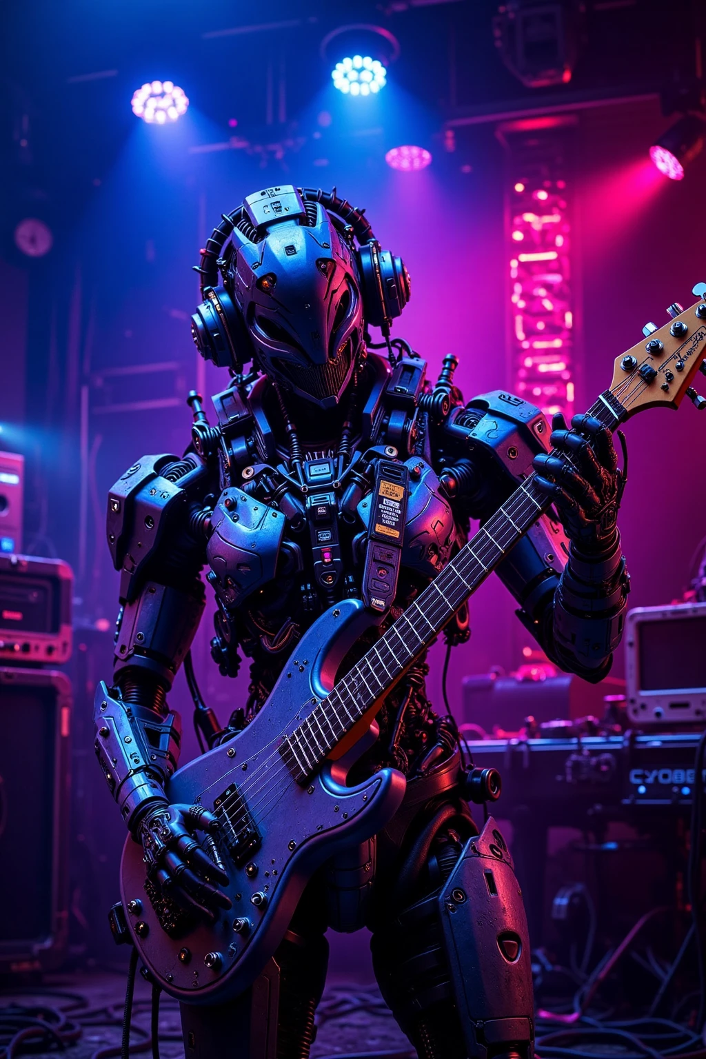 Cyberpunk - themed robotic designs, a robotic musician with digital instruments, performing on a stage in a pulsating cyber club.
