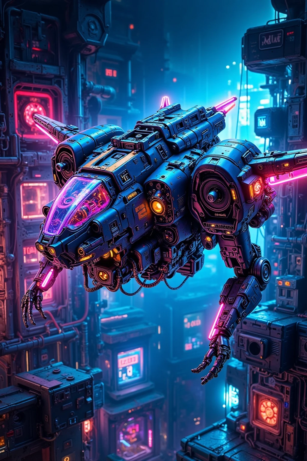 Cyberpunk - themed robotic designs, a flying robotic drone with holographic displays, soaring above a neon - streaked cyber metropolis at night.