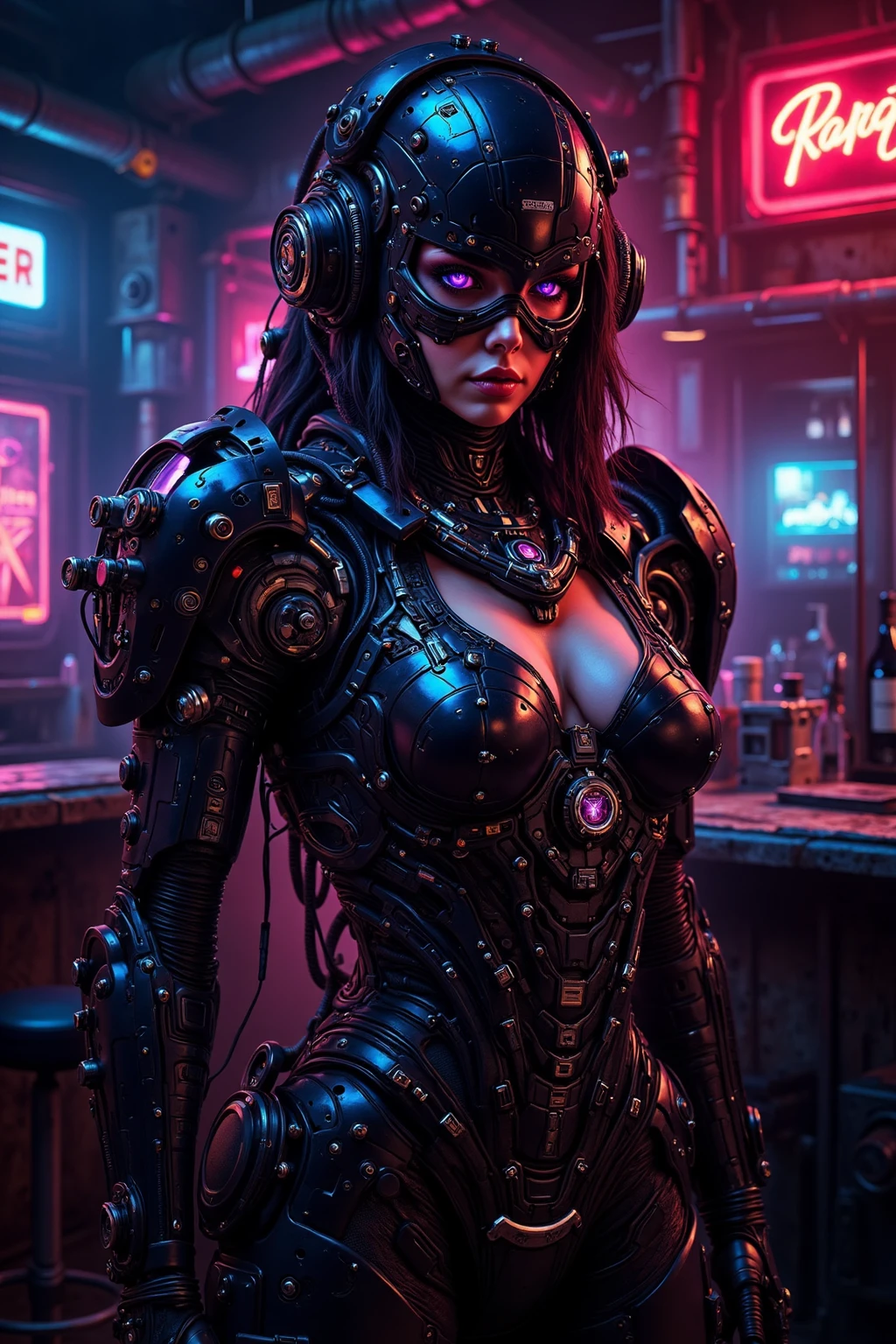 Cyberpunk - themed robotic designs, a female cyborg assassin with cybernetic implants, holding a high - powered energy pistol in a smoky cyber bar.