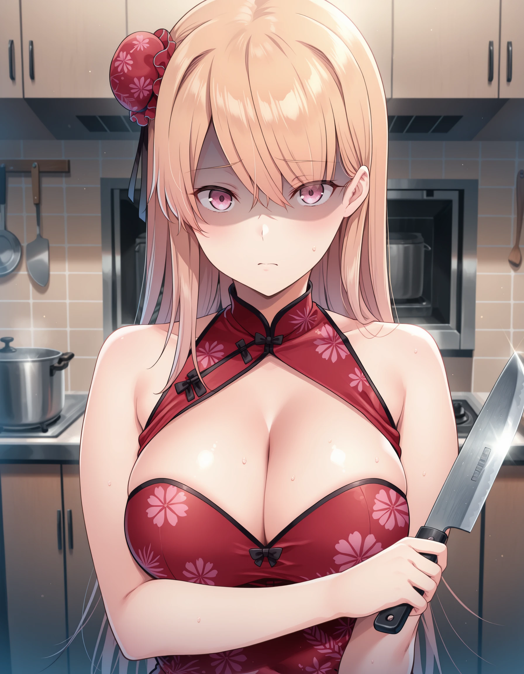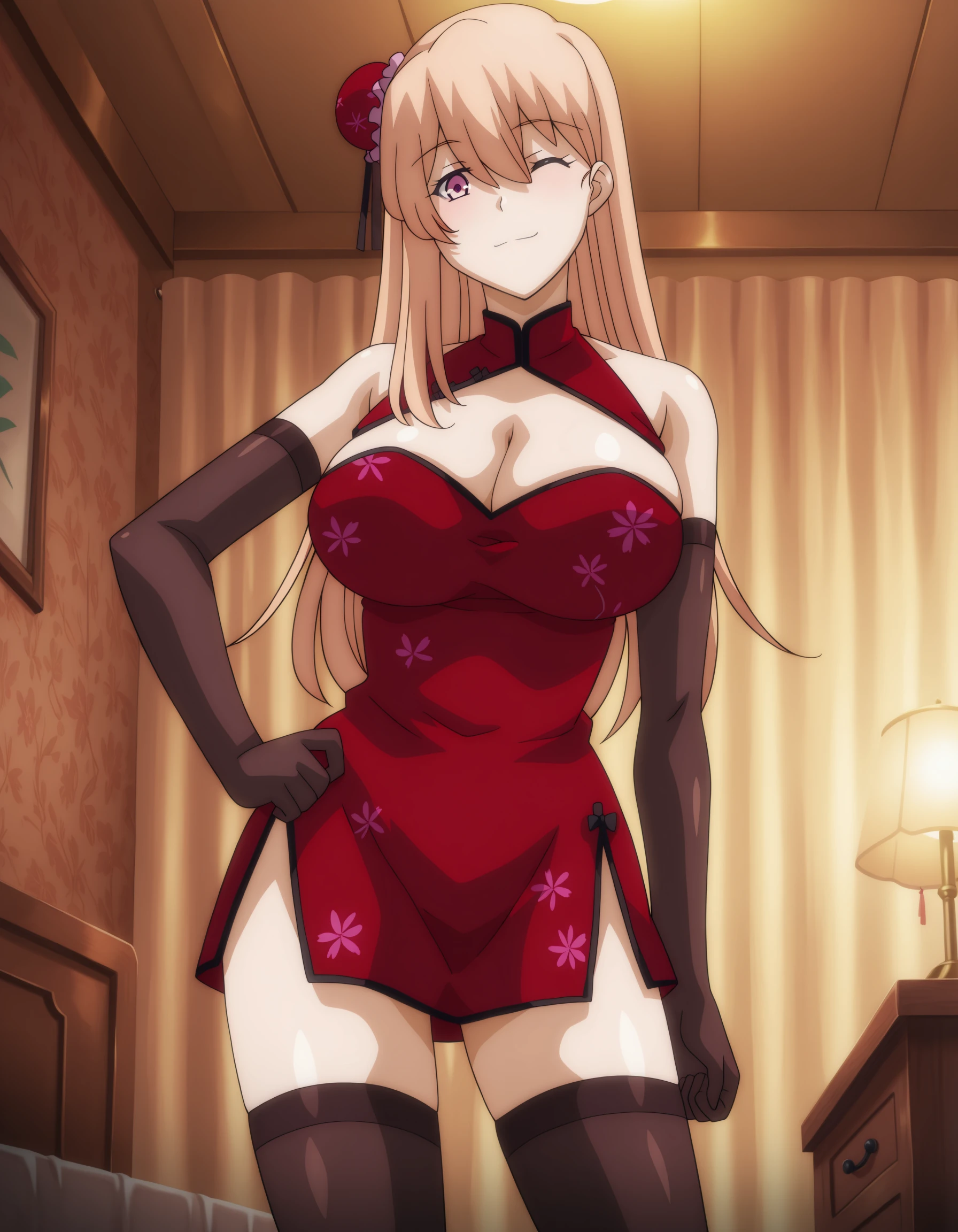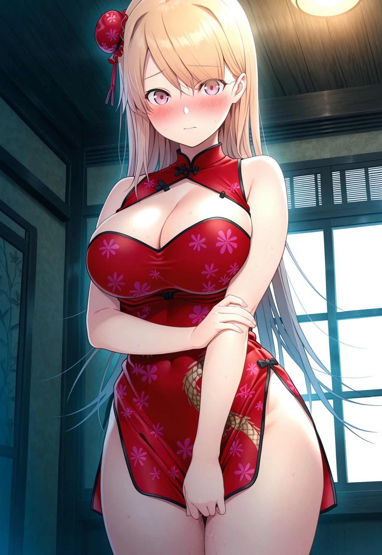 china_outfit, china dress, chinese clothes, red dress, short dress, floral print, dragon print, single hair bun, bun cover, sleeveless, cleavage