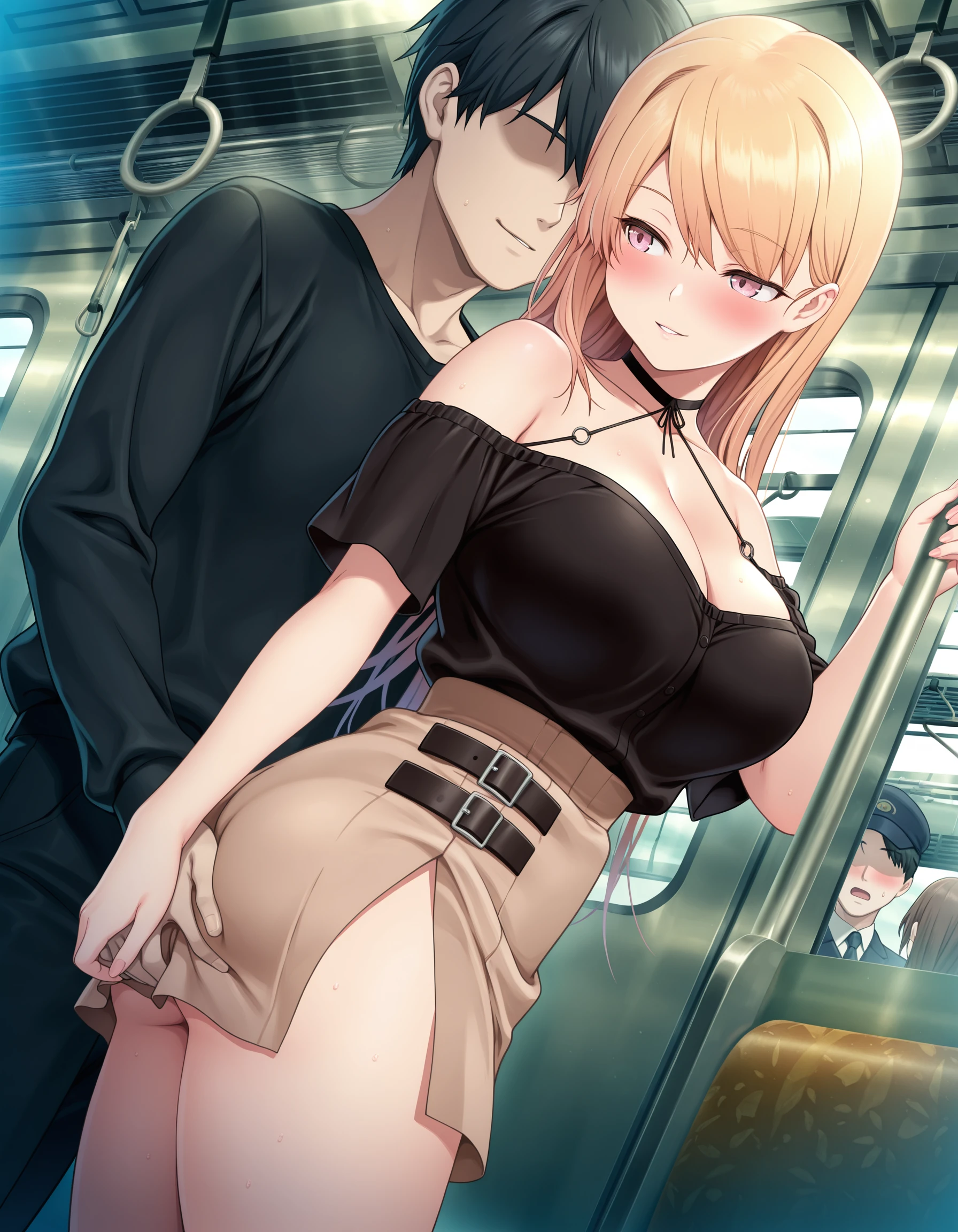default_outfit, black shirt, off-shoulder shirt, choker, halterneck, criss-cross halter, short sleeves, high-waist skirt, brown skirt, shirt tucked in, belt buckle