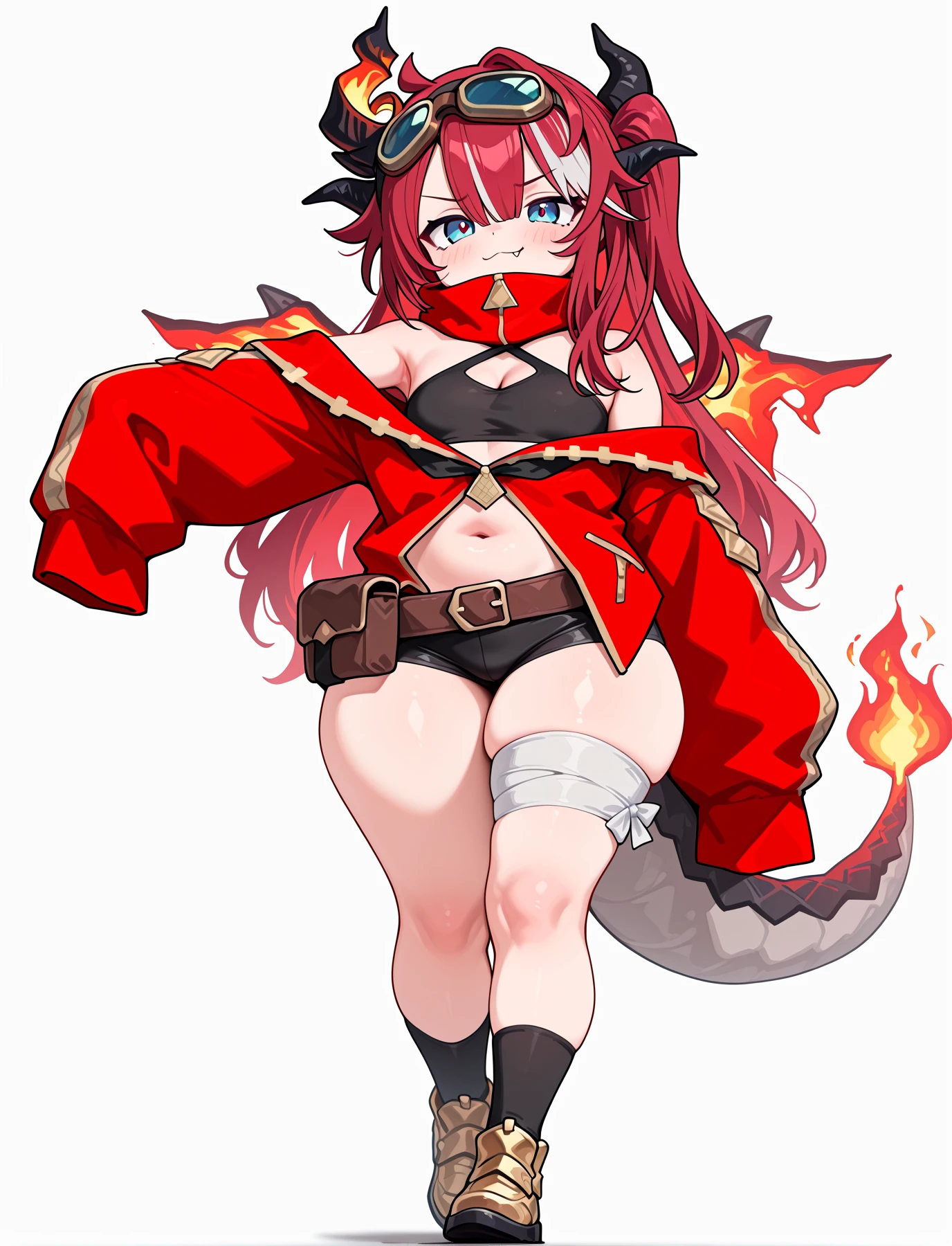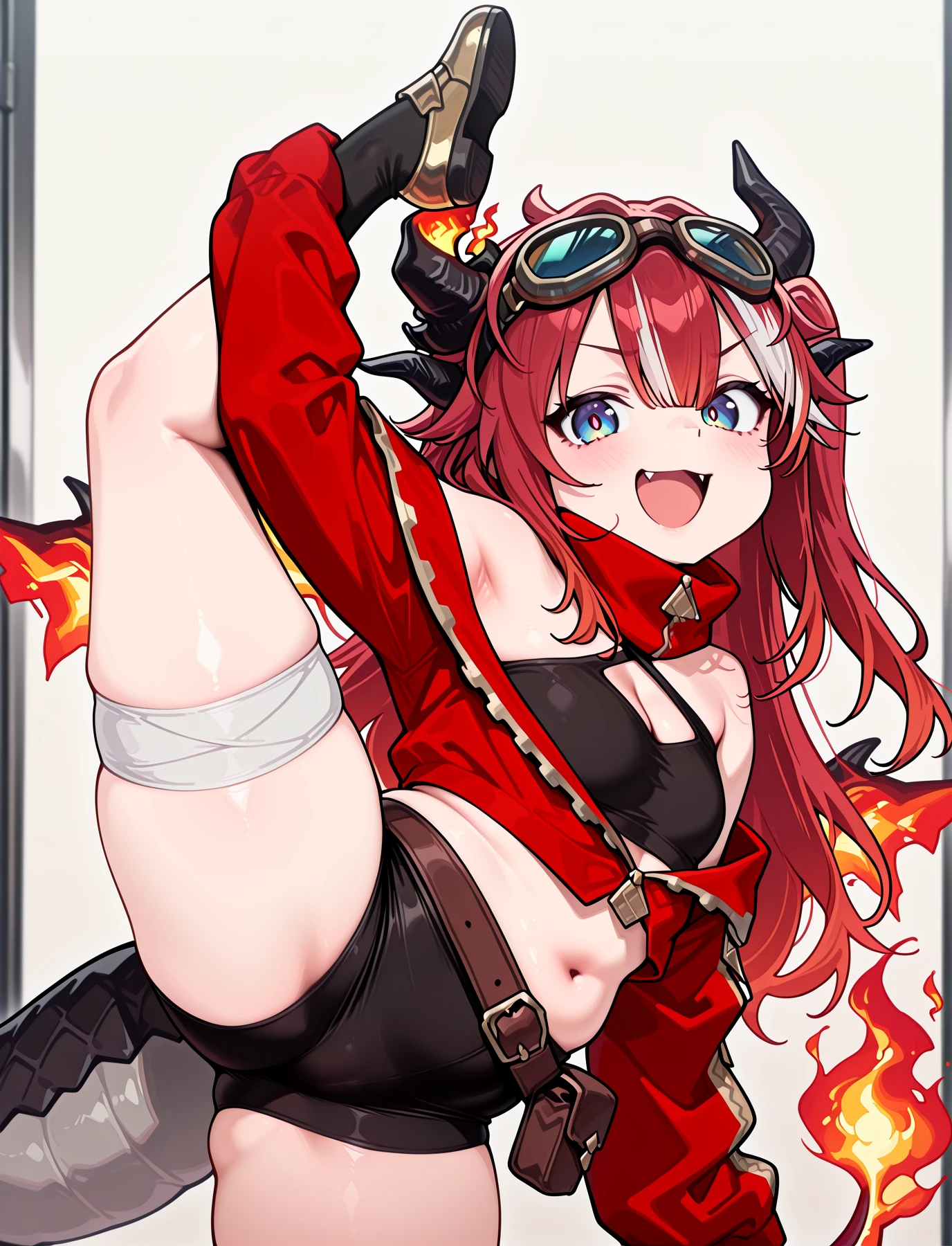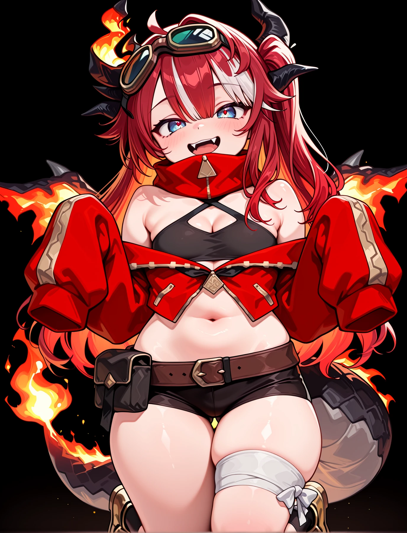 Sayaxx, blue eyes, red hair, white streaked hair, hair between eyes, bangs, sidelocks, long hair, asymetrical horns, flame wings, dragon tail, fire on tail, goggles on head,