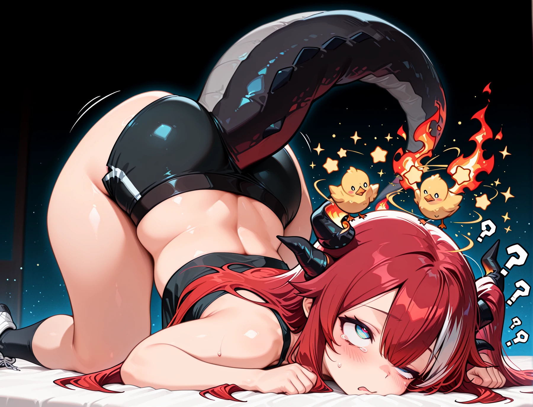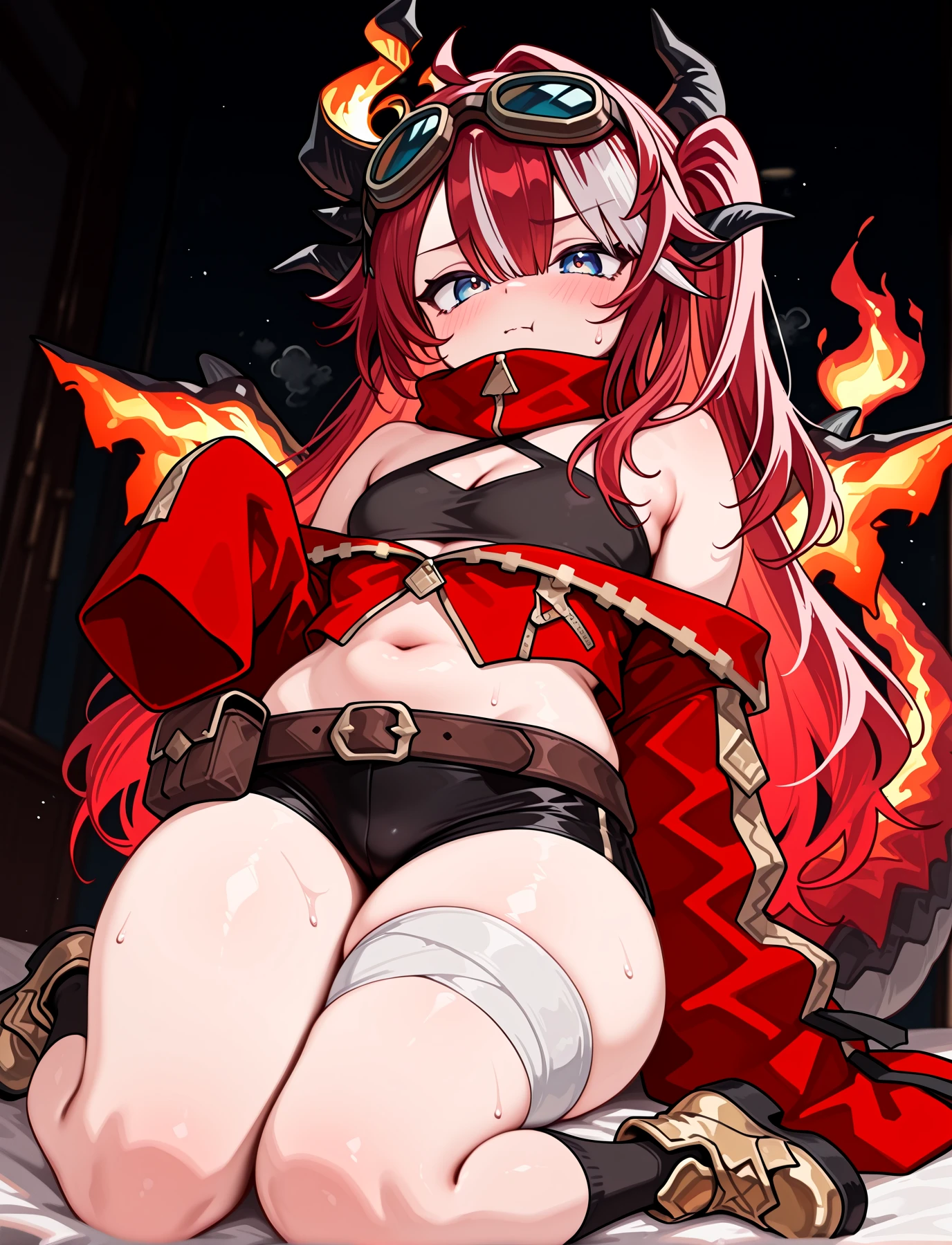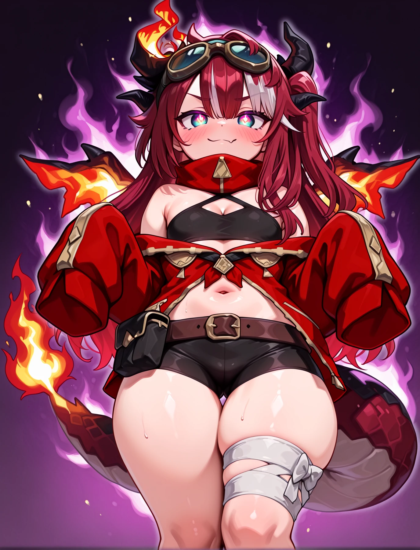 Sayaxx, blue eyes, red hair, white streaked hair, hair between eyes, bangs, sidelocks, long hair, asymetrical horns, flame wings, dragon tail, fire on tail, goggles on head,
