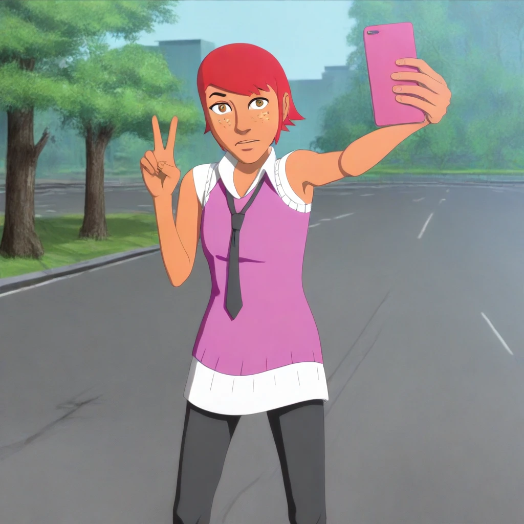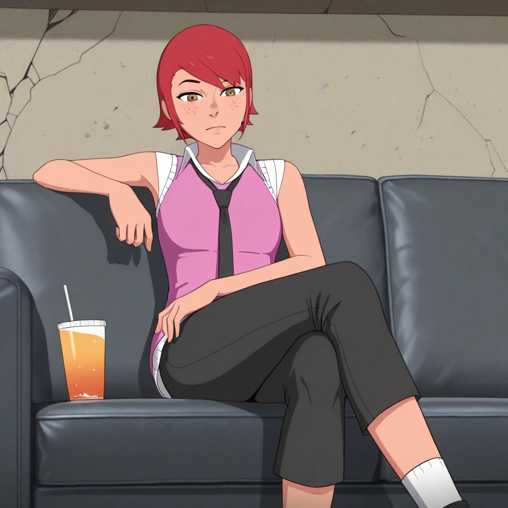 pepper_imaa, 1girl, short hair, red hair, brown eyes, freckles, necktie, collared shirt, sleeveless, pants