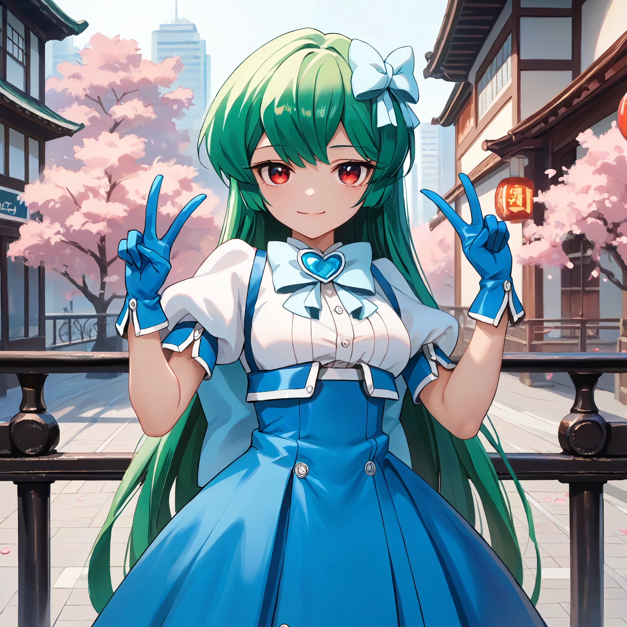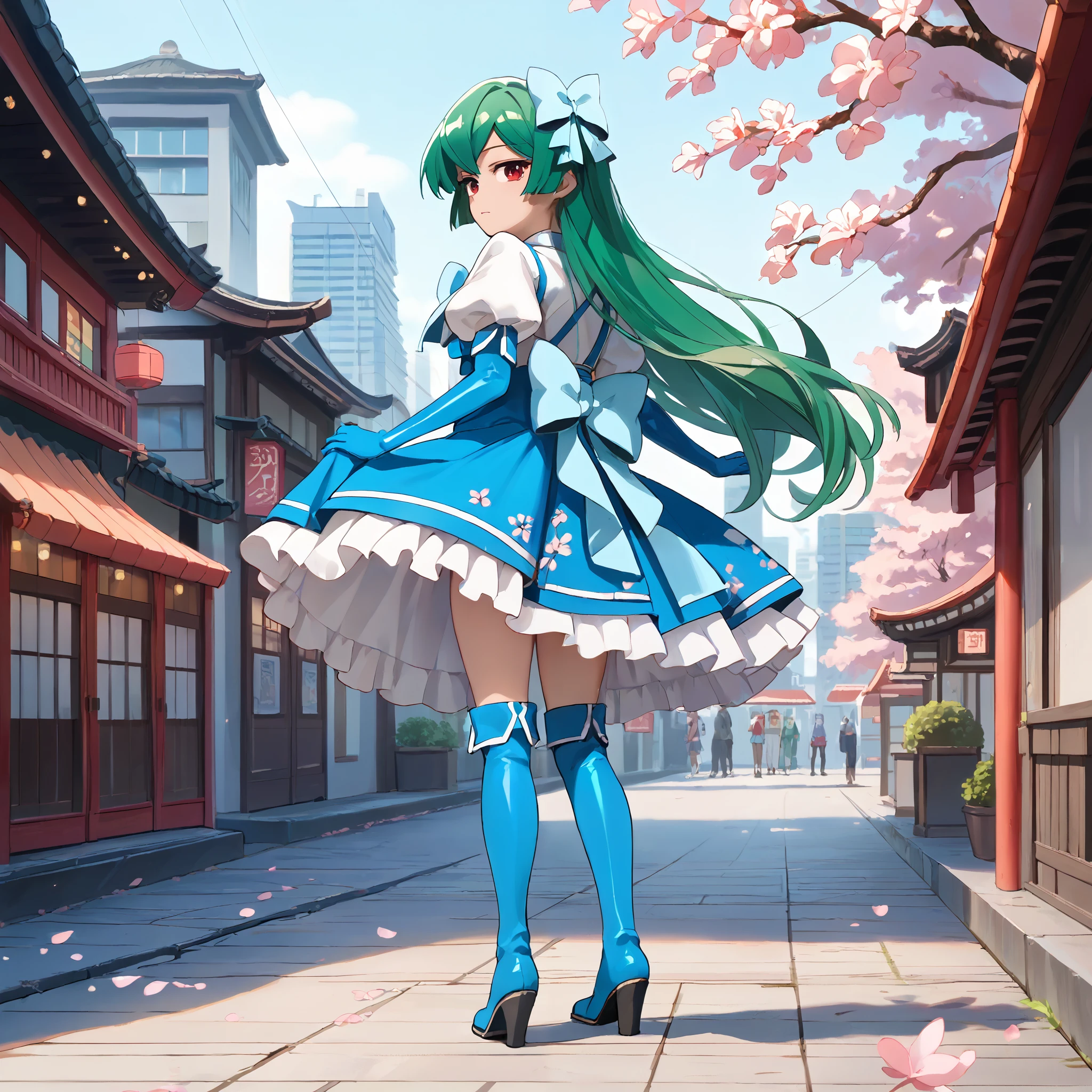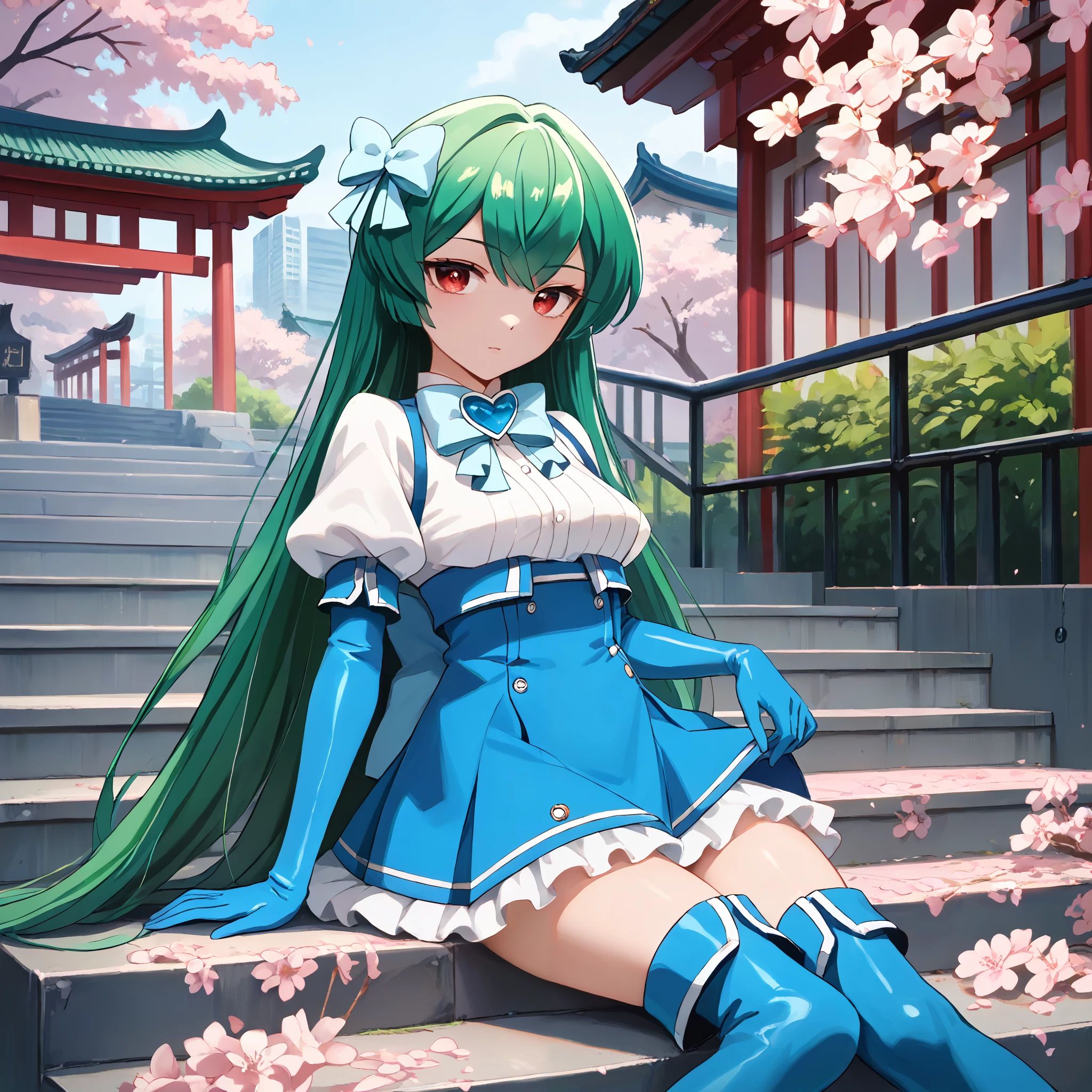 Magical Girl Uniform : minakami sayo, red eyes, green hair, long hair, magical girl, hair bow, blue bow, blue dress, blue bowtie, puffy short sleeves, white sleeves, elbow gloves, blue gloves, blue skirt, high-waist skirt, frilled skirt, thigh boots, blue footwear,