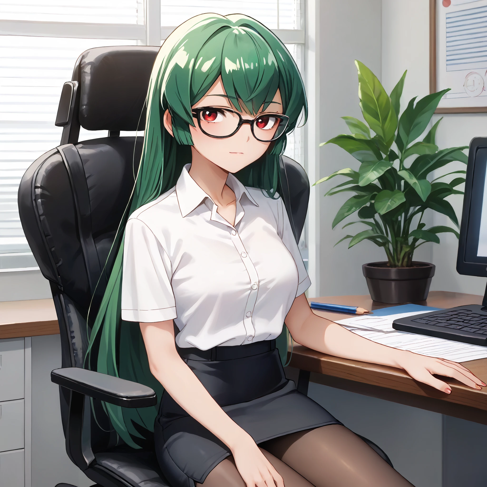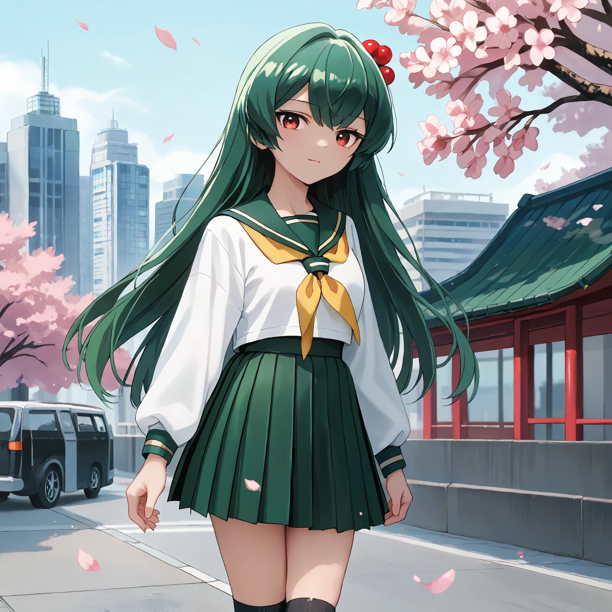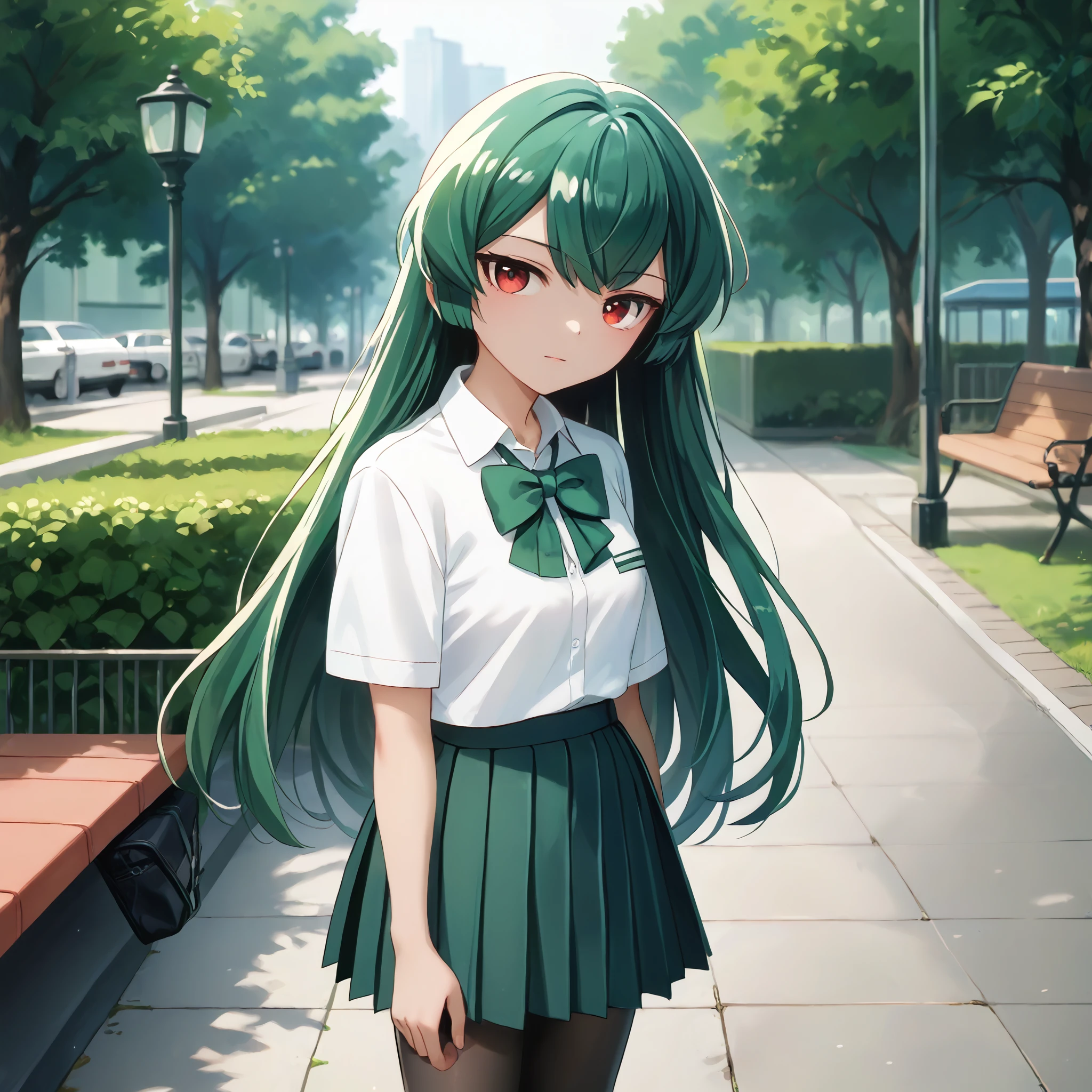 Magical Girl Uniform : minakami sayo, red eyes, green hair, long hair, magical girl, hair bow, blue bow, blue dress, blue bowtie, puffy short sleeves, white sleeves, elbow gloves, blue gloves, blue skirt, high-waist skirt, frilled skirt, thigh boots, blue footwear,