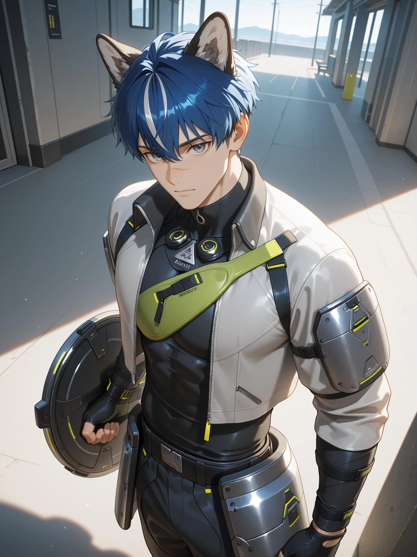 Trigger: ak_c4tcher, short hair, animal ears, blue hair, dog ears, grey eyes, streaked hair, scar on nose, hair between eyes