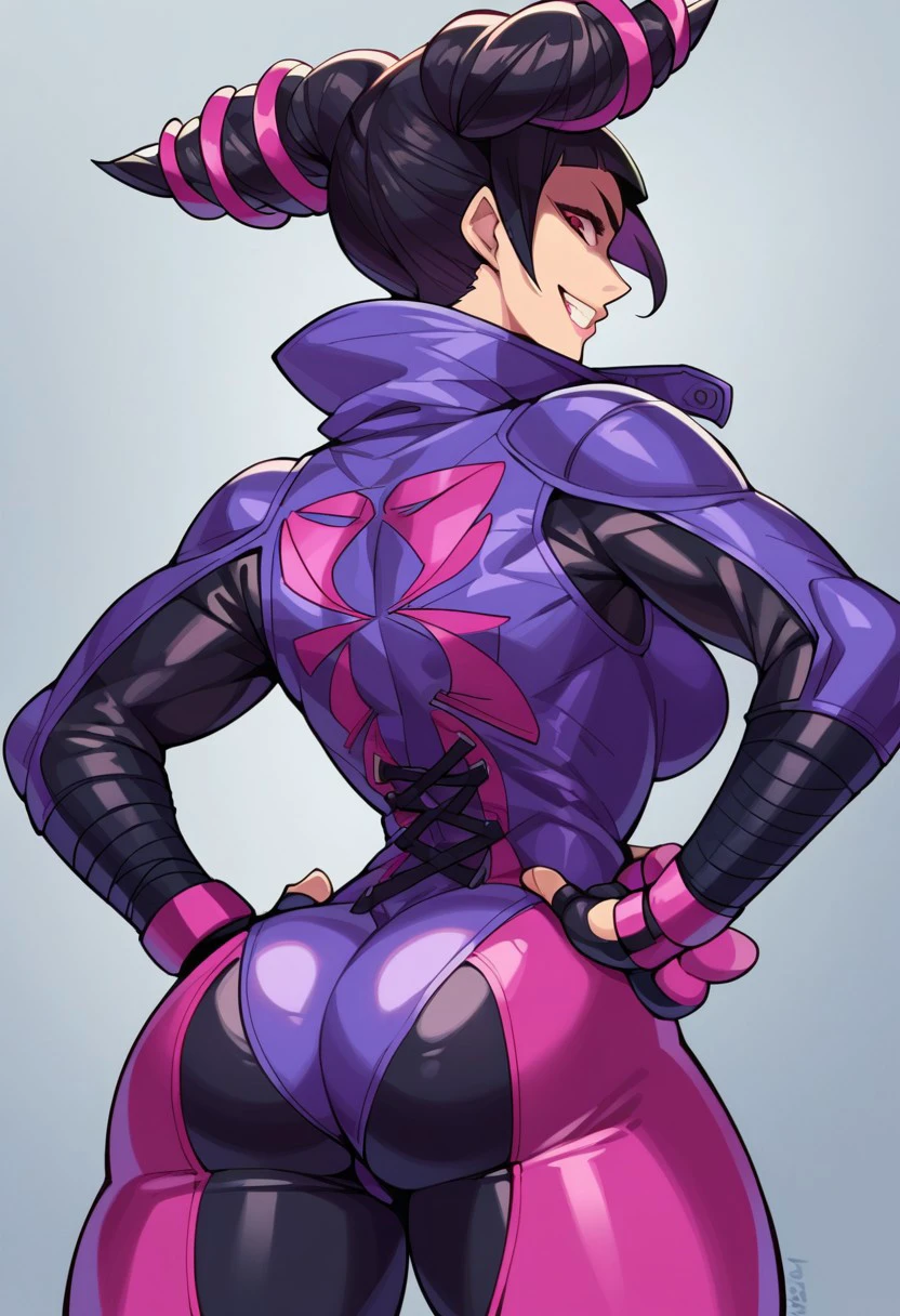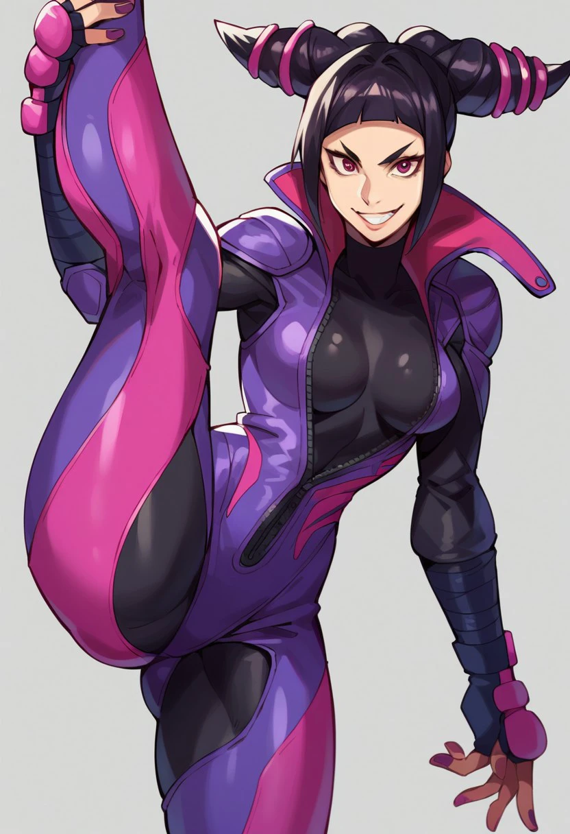 jur1 h4n, black hair, hair horns, eyepatch, gloves, fingerless gloves, bodysuit, purple bodysuit, bikesuit
