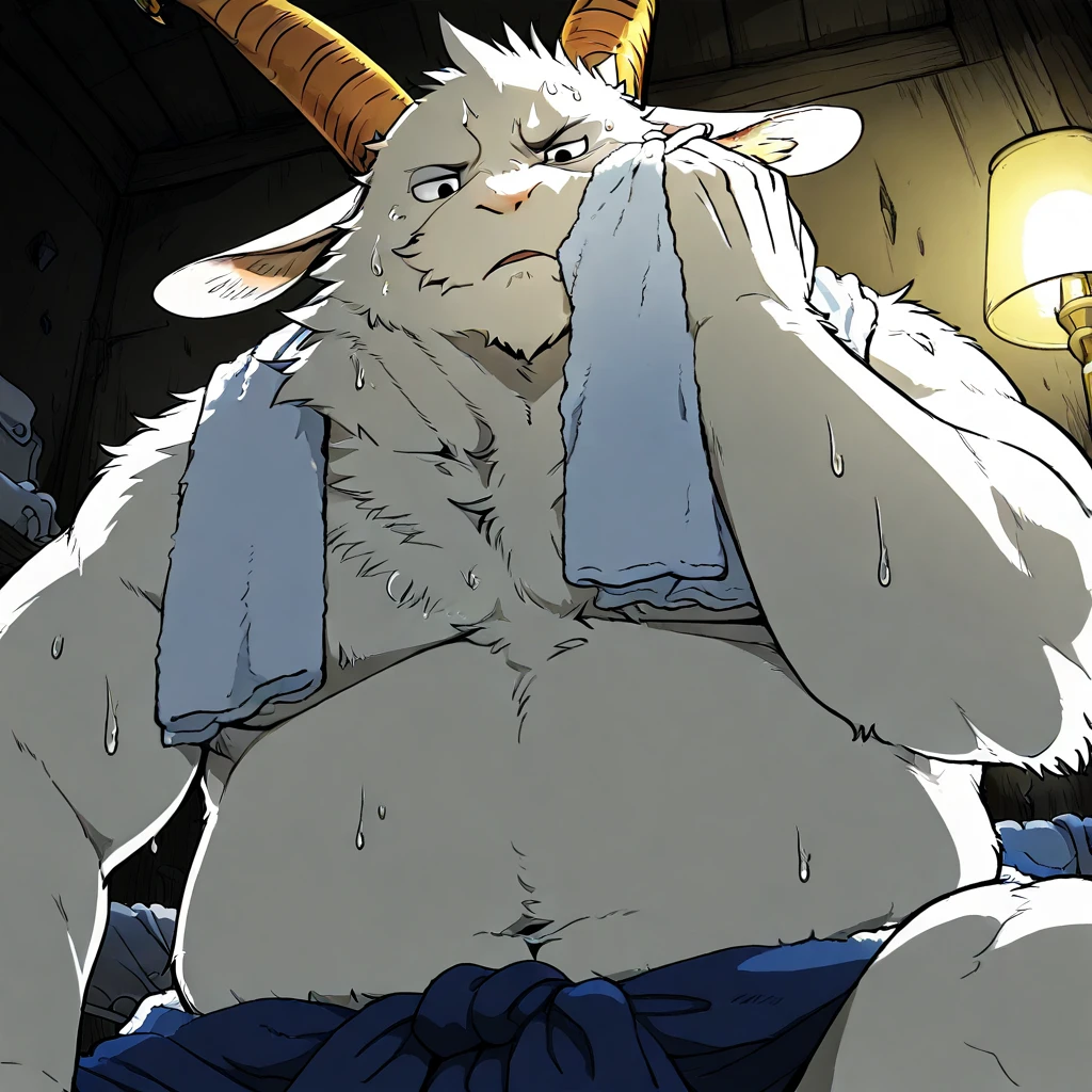 Prompt:furry,caprine,Goat horns, white fur, beard,black eyes,overweight,fat,