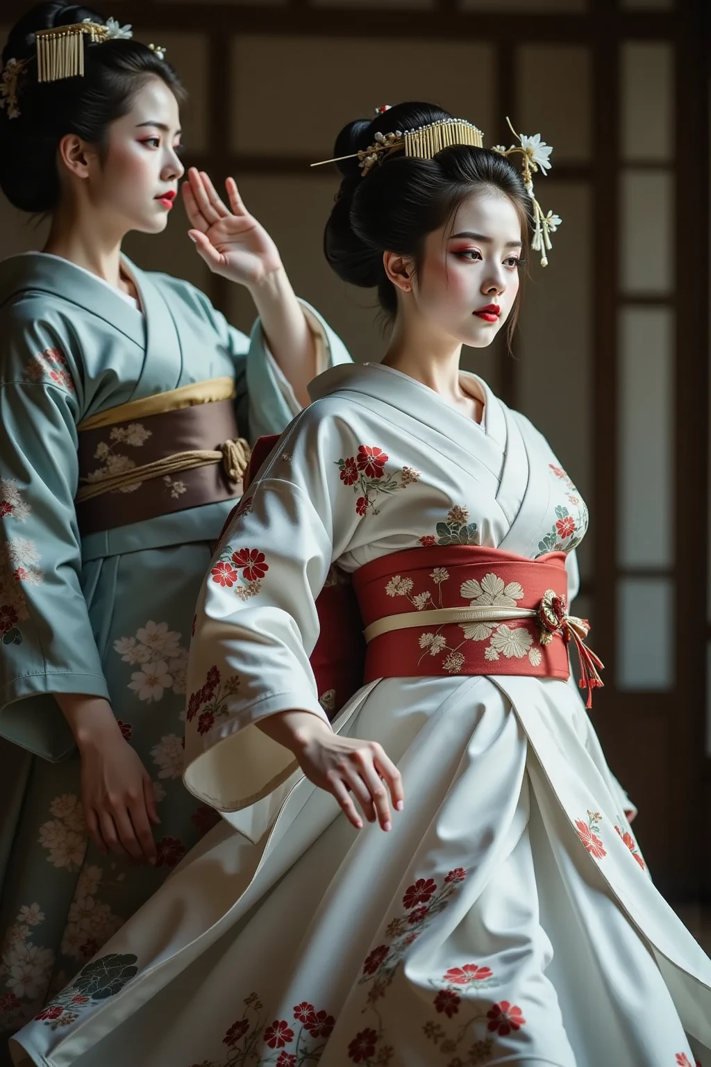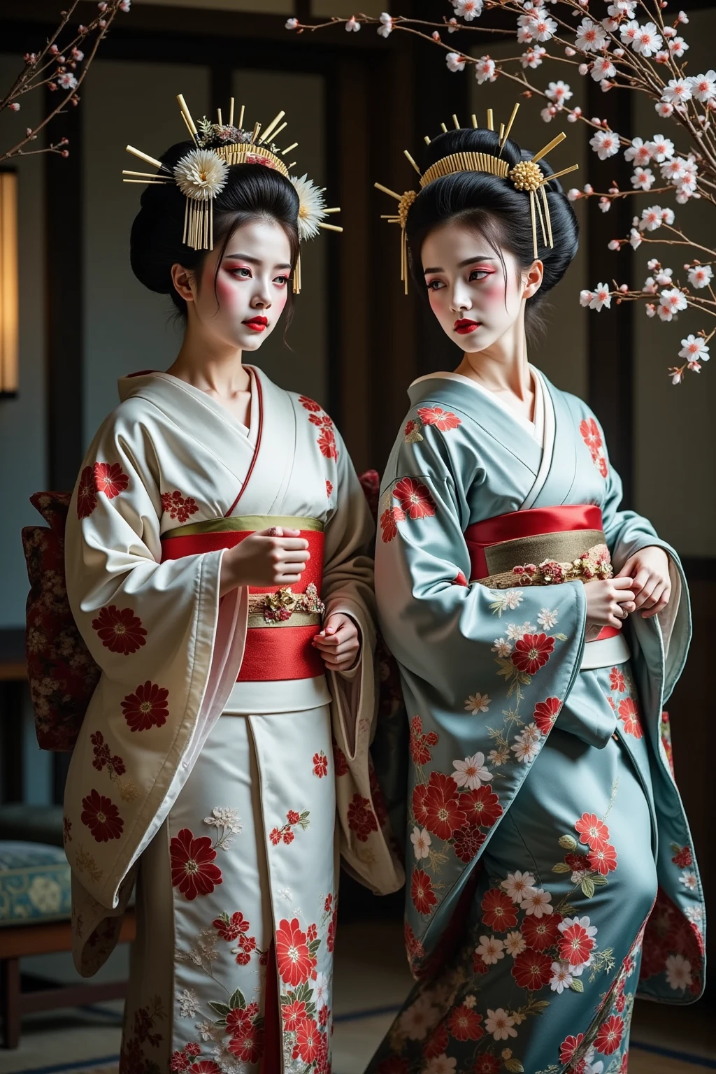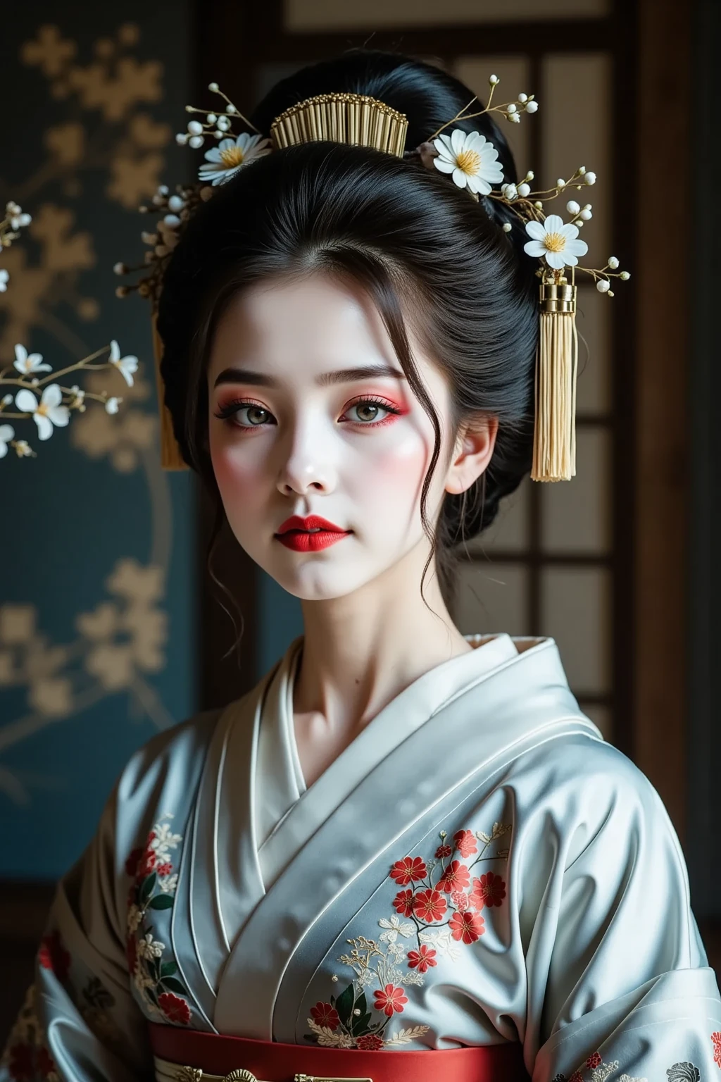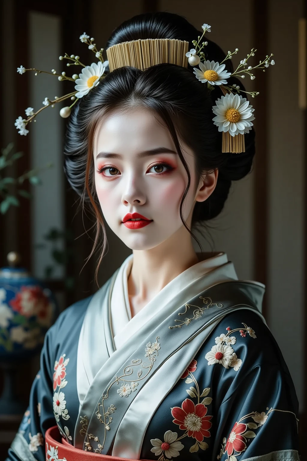日本髪の女,a woman with a striking gaze is captured in a portrait. her hair is styled in a voluminous updo,adorned with delicate white flowers. she wears a light blue kimono with intricate floral patterns and a red sash. her makeup is bold and dramatic,with dark eyeliner and red lipstick. the setting appears to be a traditional japanese room with a blue wall and a patterned curtain. the lighting is soft and diffused,highlighting the contours of her face and the intricate details of her clothing.
